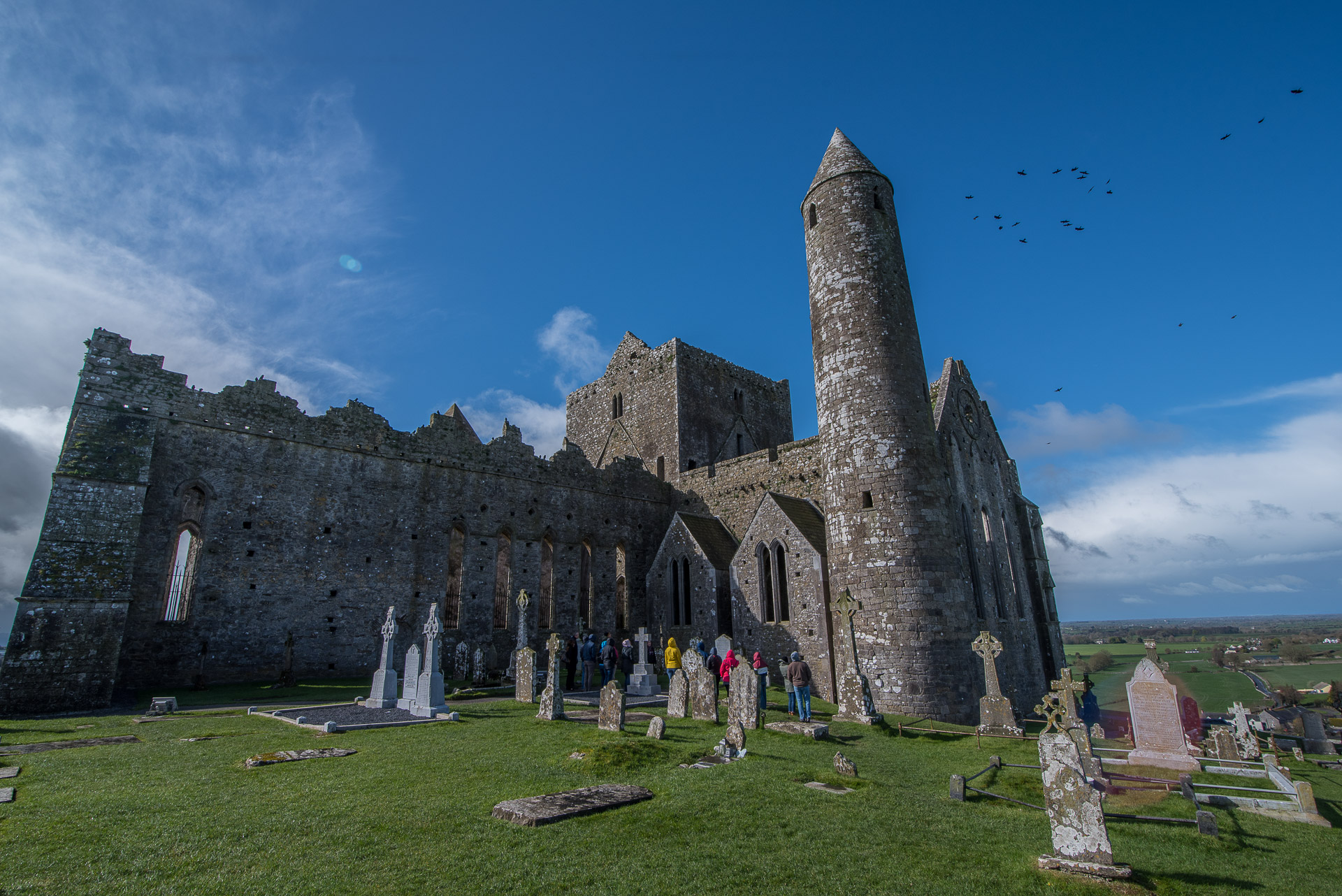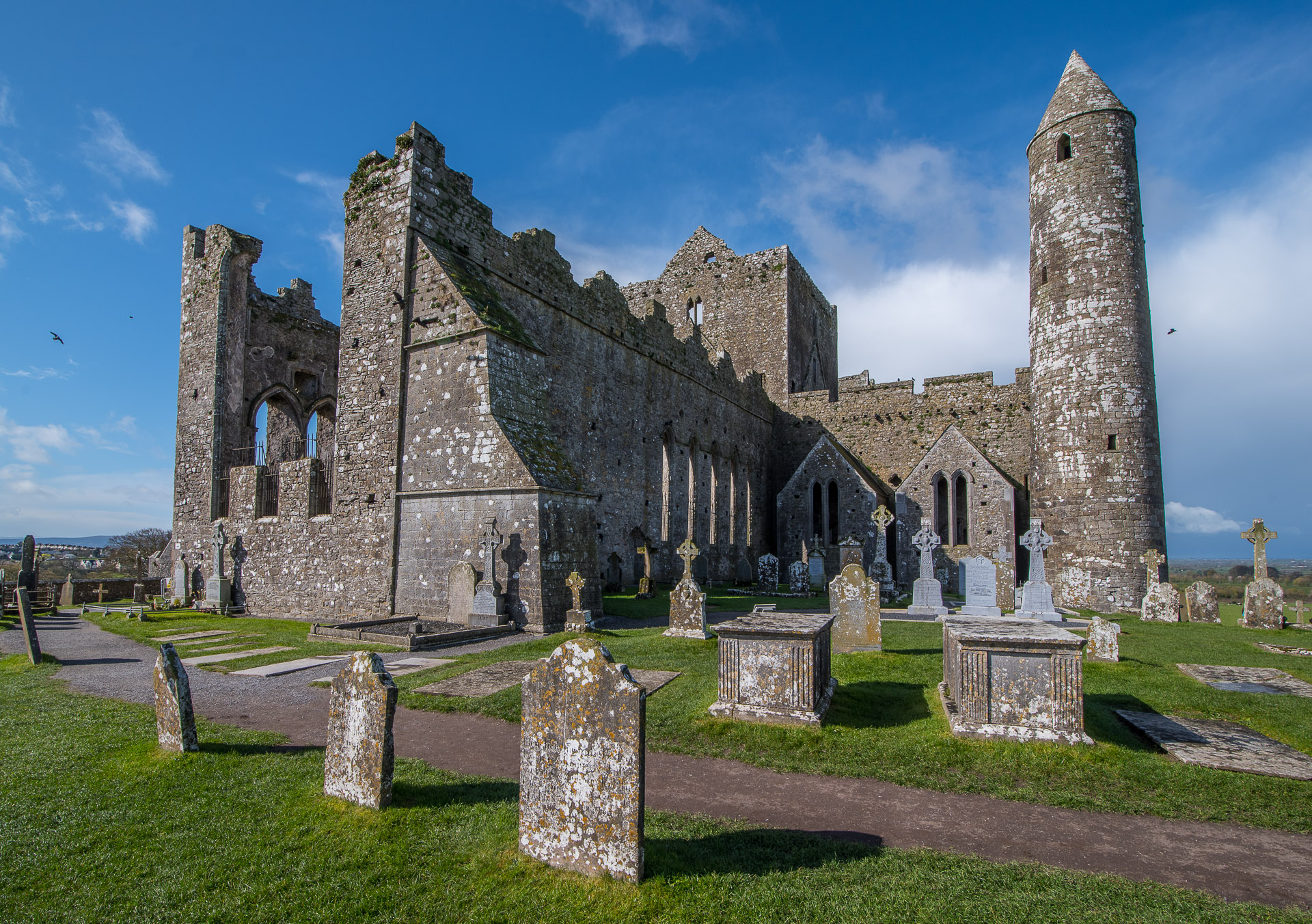 El conjunto de la Rock of Cashel se completa con una torre redonda tipica de los monasterios y las iglesias medievaes irlandeses.