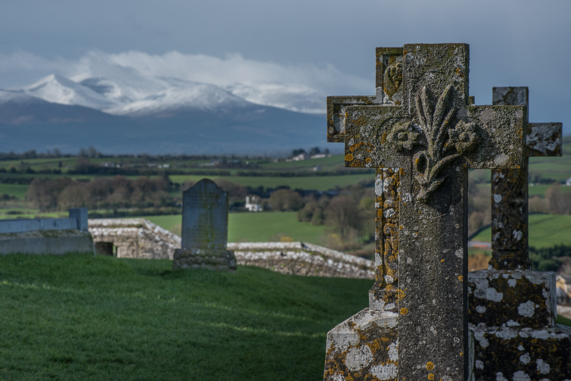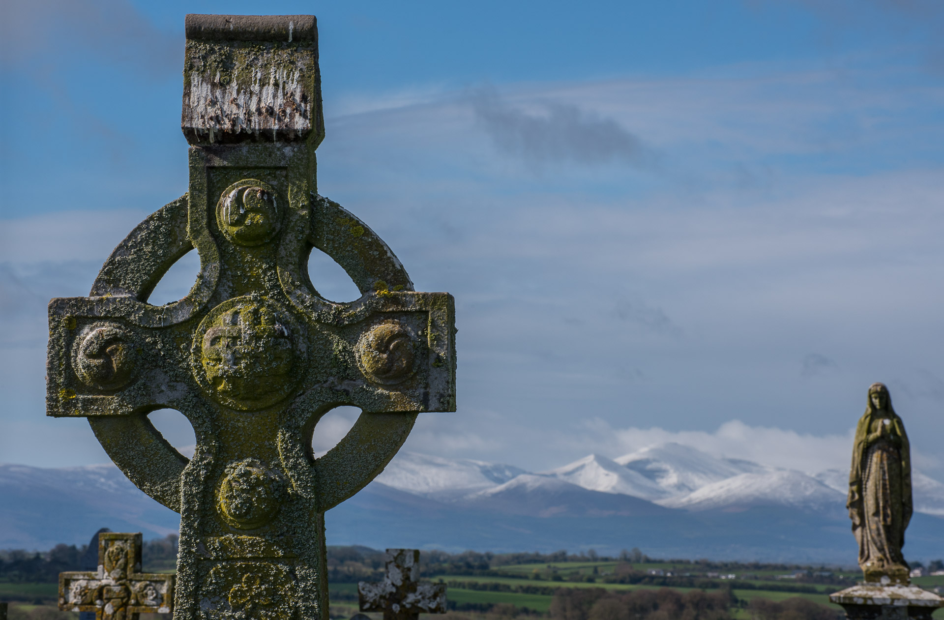 Una de las cruces del cementerio y, de fondo, las montañas nevadas a primeros de un frío mes de abril en Irlanda.