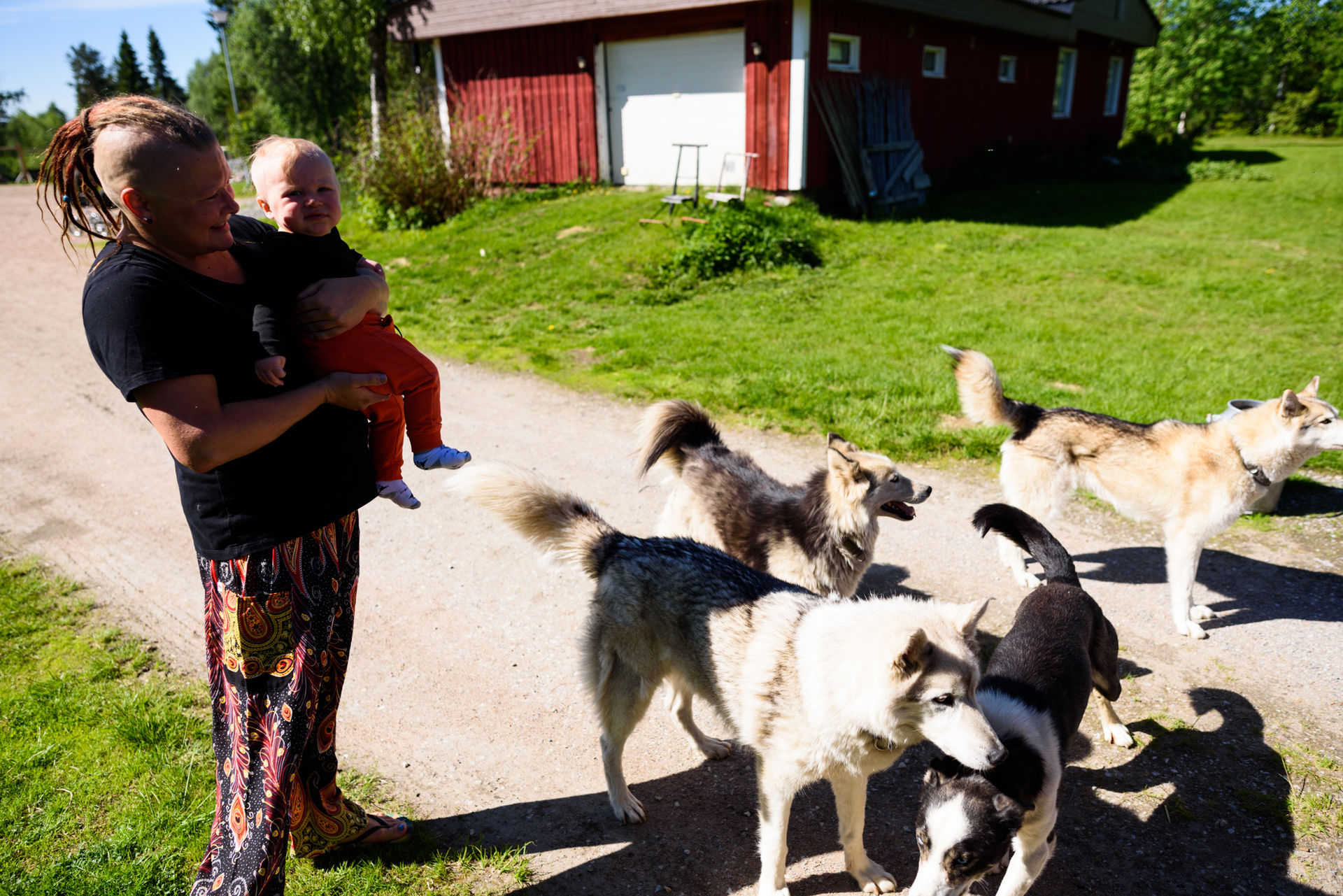 En el recorrido paramos en Kota-Husky, una granja familiar dedicada a los safaris con estos animales, justo al lado del Parque Nacional de Riisintunturi. Nos recibe una joven madre, rodeada de varios perros y empujando un carrito donde todavía duerme su bebé, de pocos meses y un pelo rubio platino.