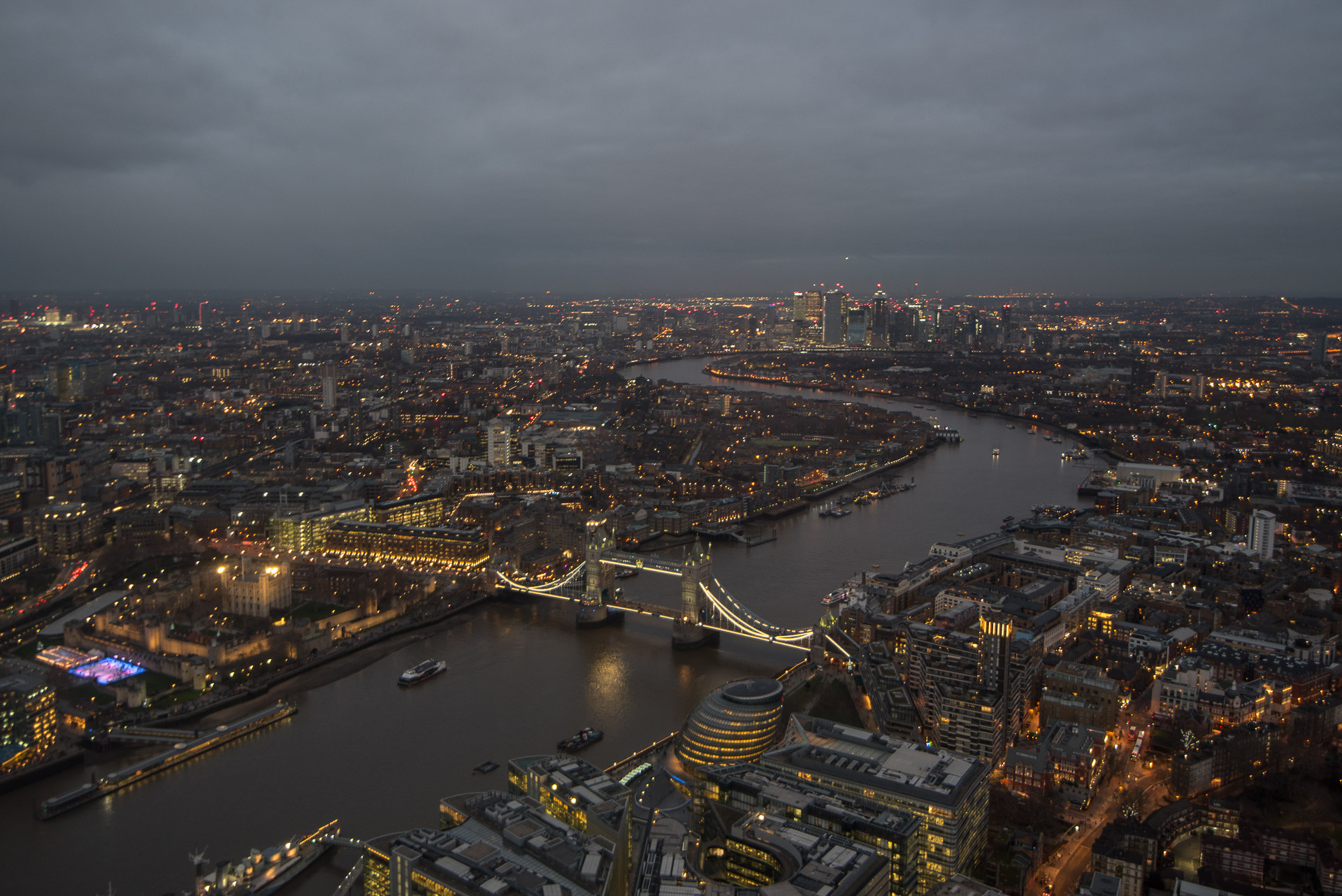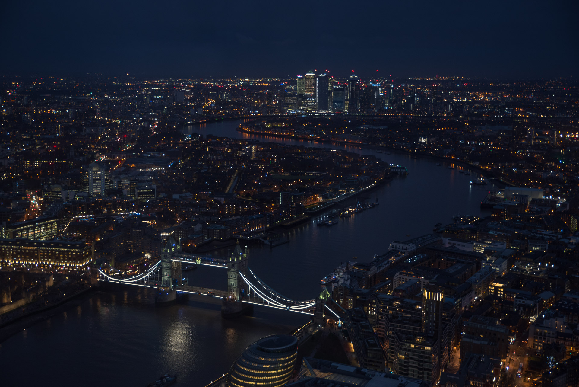 La espectacular vista desde lo alto de The Shar hacia el este, con el Puente de la Torre en primer plano.