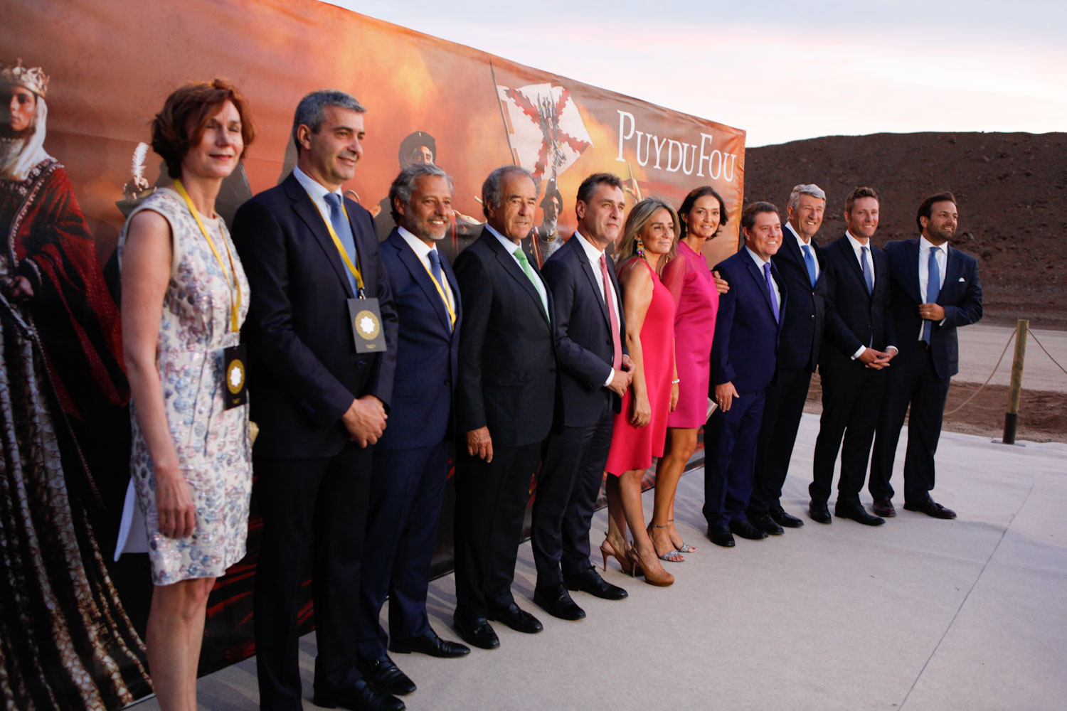 Reyes Mayoro, Emiliano García Page y Milagros Tolón posan junto a los fundadores de Puy du Fou.