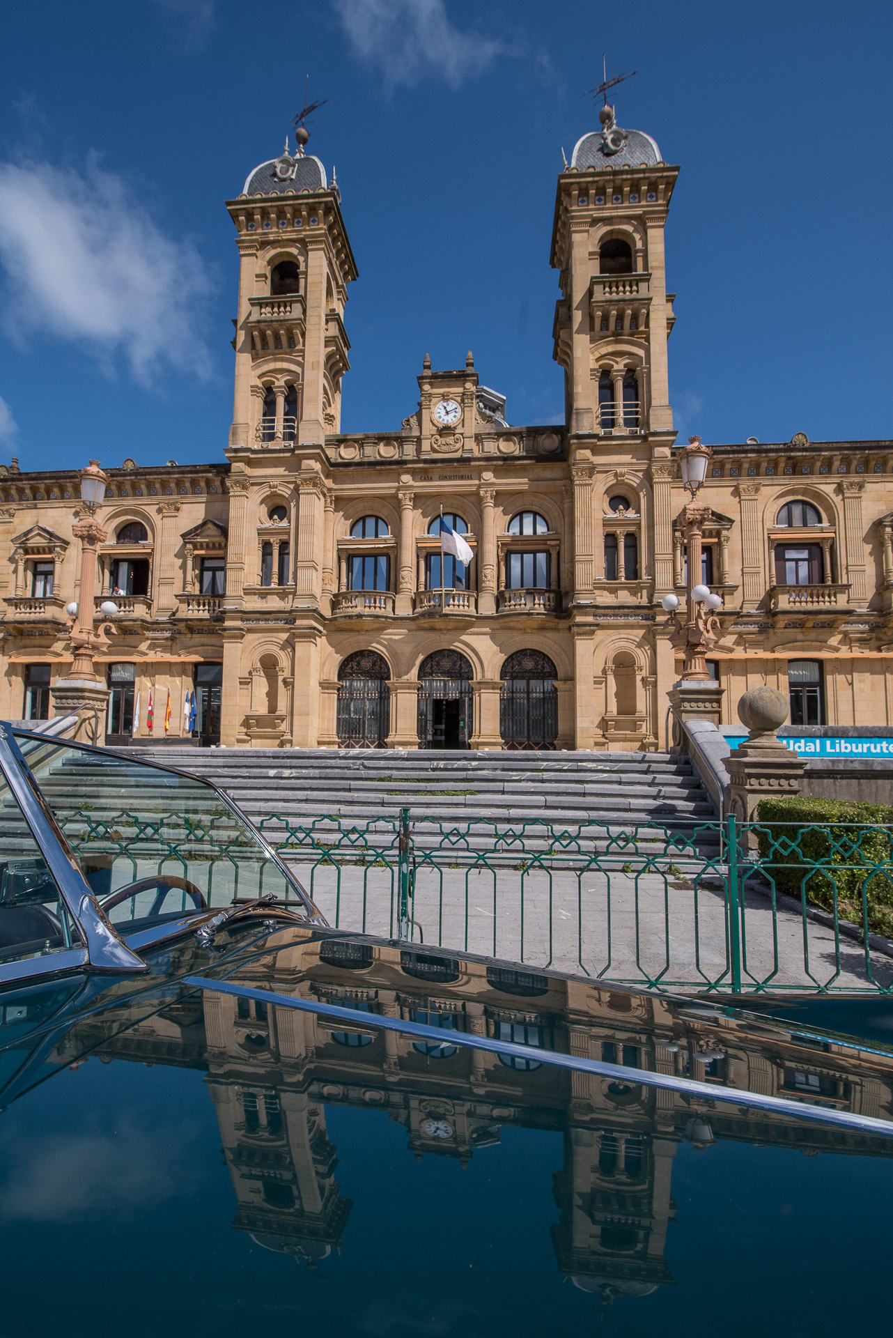 El Ayuntamiento de San Sebastián, construido para albergar un casino, reflejado en el capó de un coche clasico.