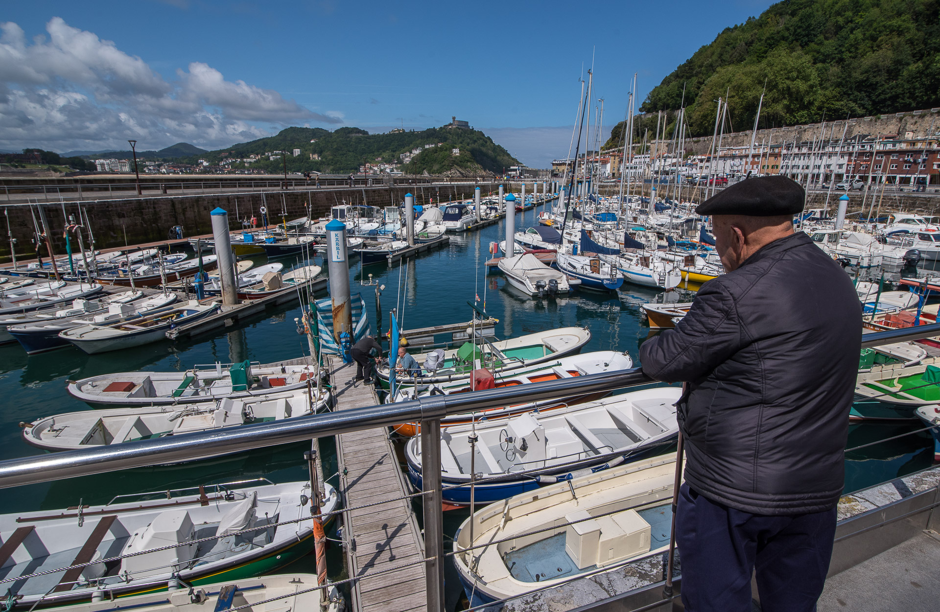 Un donostiarra contempla las pequeñas embarcaciones en el puerto.