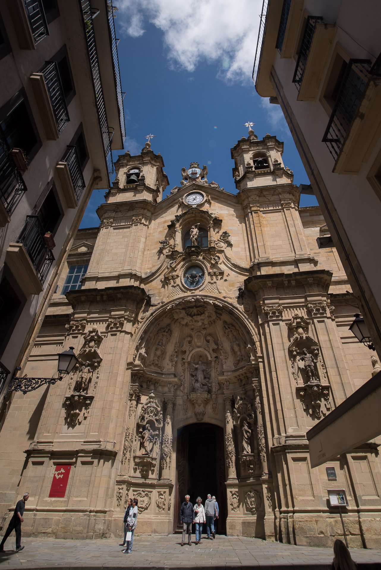 La imponente fachada barroca de la Basílica de Santa María, que parece encogida en las estrechas calles de la Parte Vieja.
