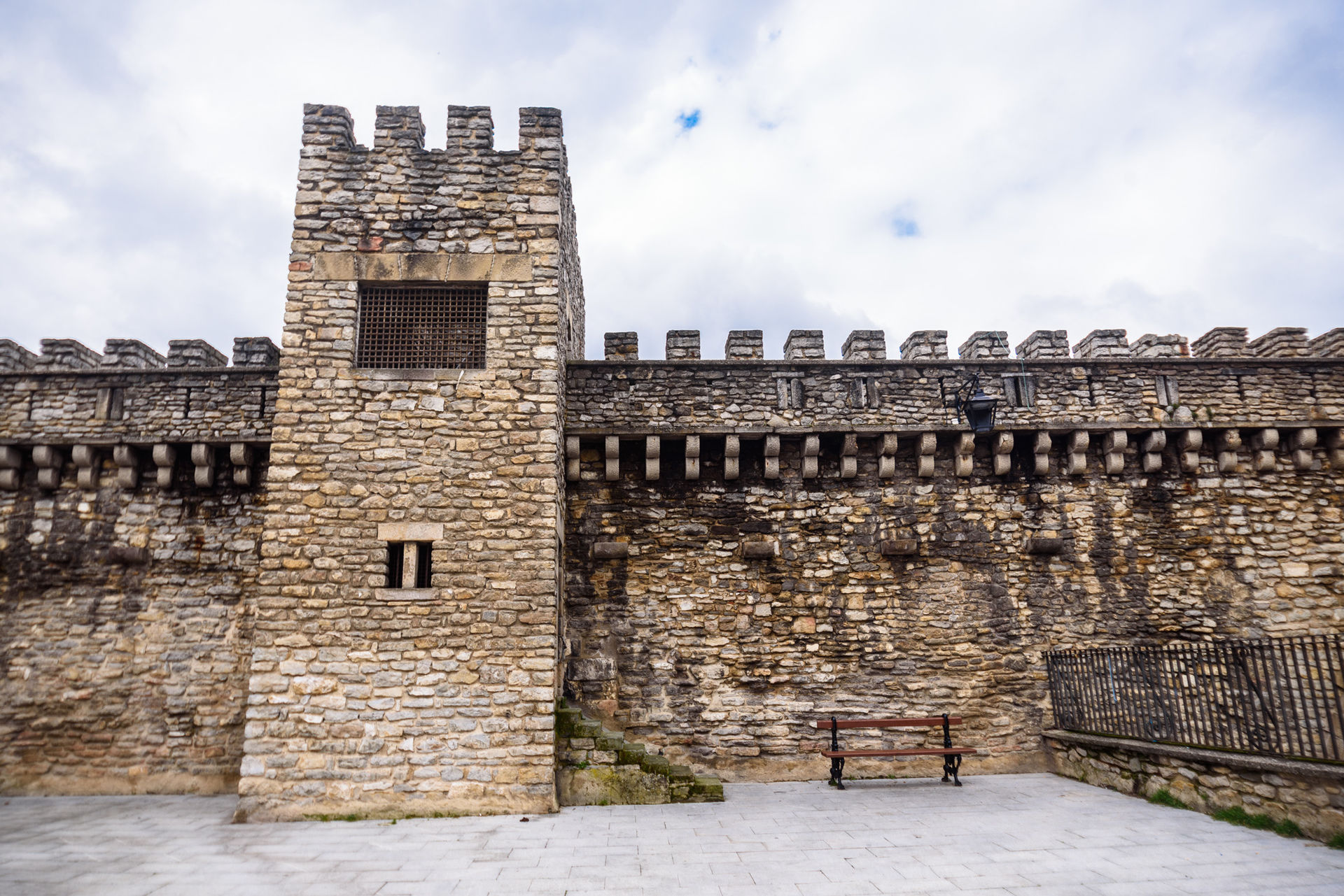 Se conserva principalmente la llamada Primera Muralla, del siglo XI (de la muralla gótica del XIII quedan algunos restos en la iglesia de San Pedro). En la foto, la zona junto al Palacio Escoriaza-Esquivel se restauró en estilo lombardo.