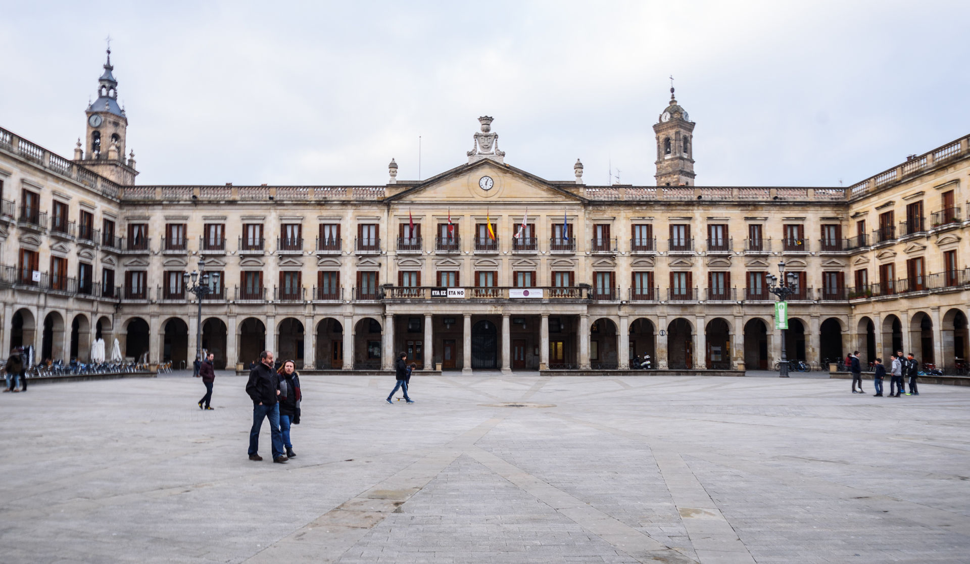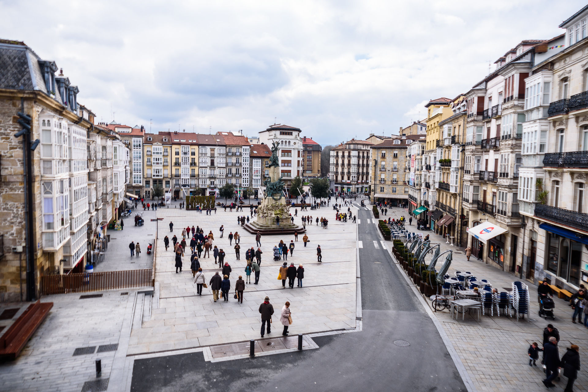 La plaza de la Virgen Blanca en toda su amplitud vista desde la plaza de Machete, junto a la estatua de Celedón.