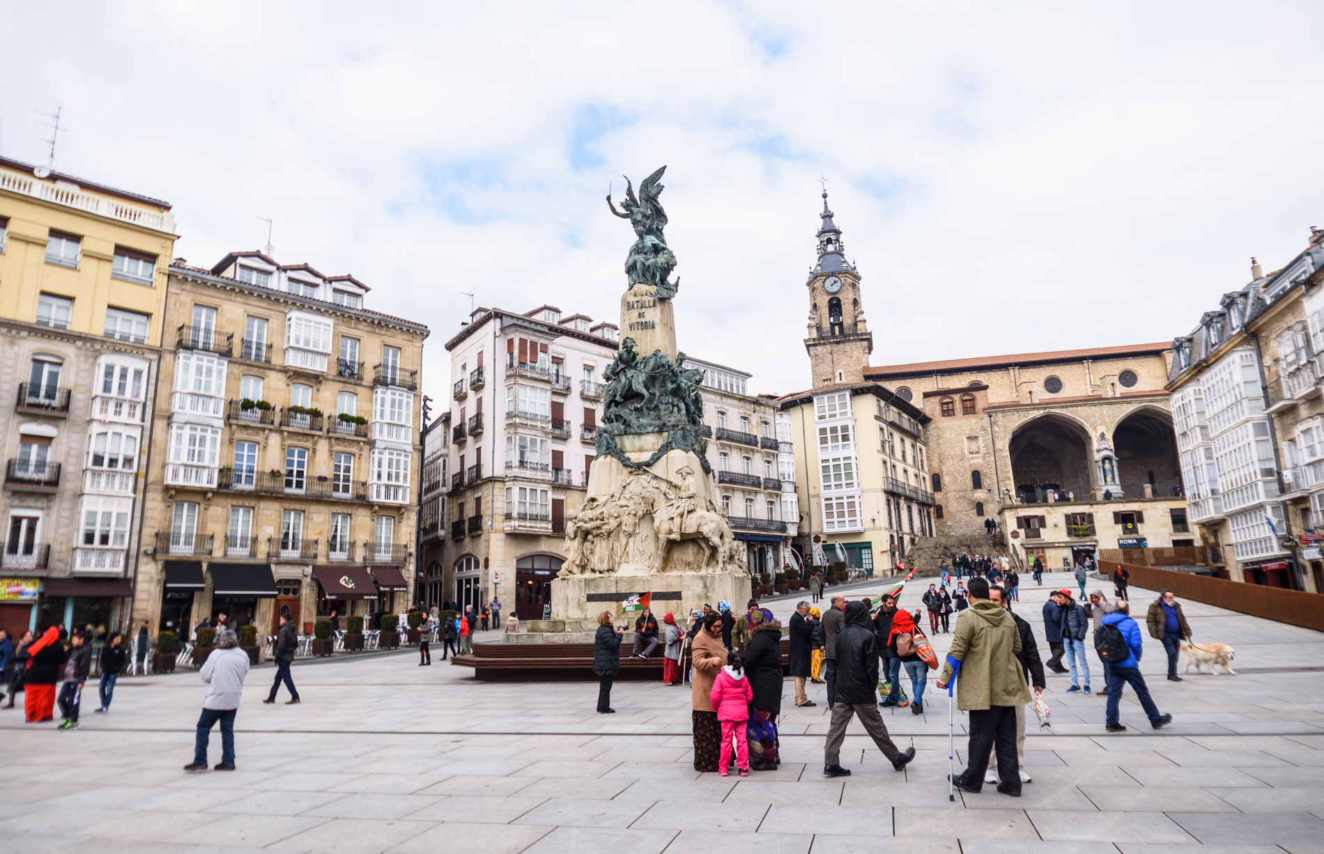 La reconocible Plaza de la Virgen Blanca que es la mejor postal de bienvenida a cada viajero que visita Vitoria. En 1917 se inauguró en el centro el Monumento a la Batalla de Vitoria.
