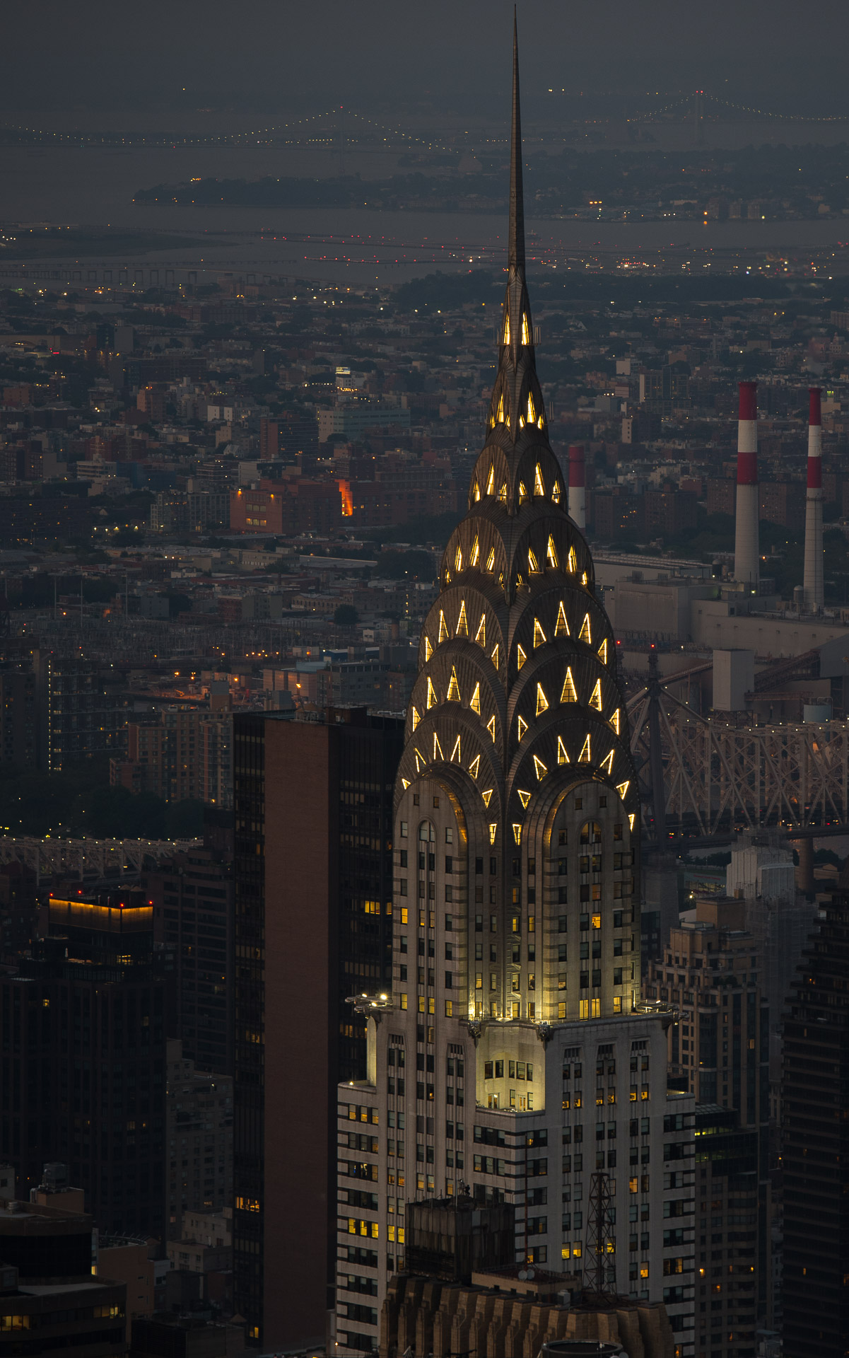 La famosa y bellísima cúpula del Chrysler Building tal y como se ve al anochecer desde el Empire State.