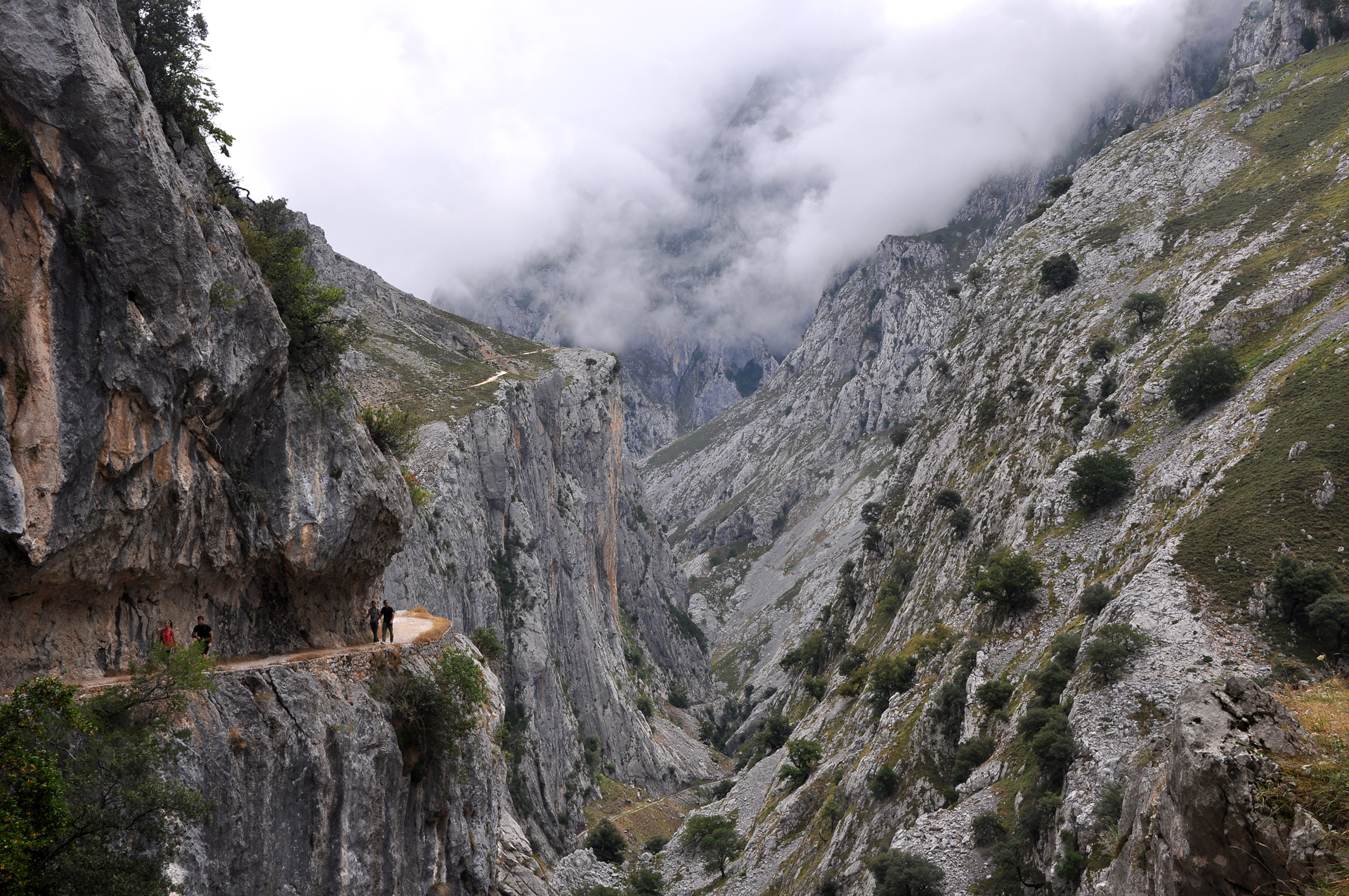 Varios montañeros disfrutan de la Ruta del Cares en el Parque Nacional de los Picos de Europa. Un impresionante paseo entre desfiladeros que hará que nuestras neuronas dejen de pensar en las interminables preocupaciones de la vida y se concentren únicamente en el paseo. La ruta transcurre entre las localidades de Caín y Poncebos.