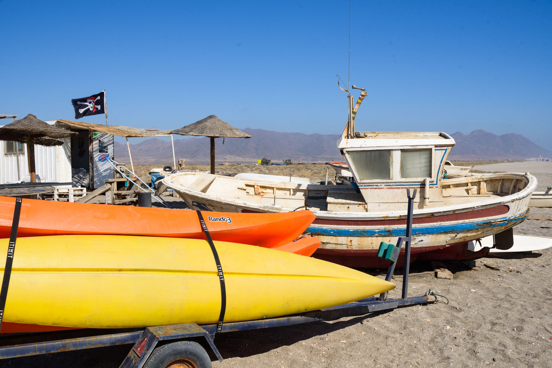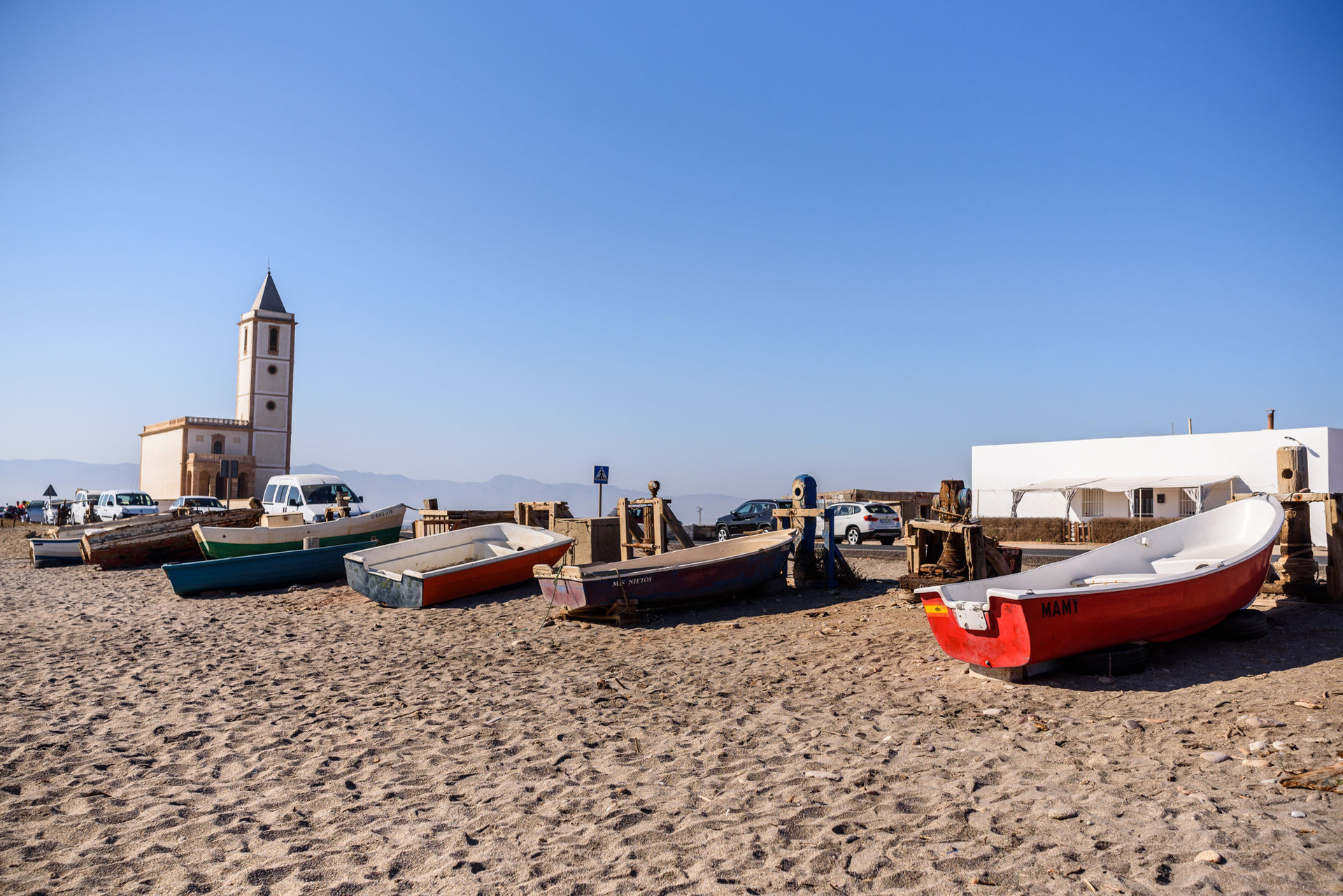 Una pequeña embarcación junto a dos piraguas en la playa de la localidad de Cabo de Gata. Tiene una población de 1.375 habitantes, ampliándose notablemente en verano. La barriada se encuentra inmersa en el Parque Natural de Cabo de Gata-Níjar, encontrándose a solamente dos kilómetros de las salinas de Cabo de Gata y a 7 kilómetros del faro de Cabo.