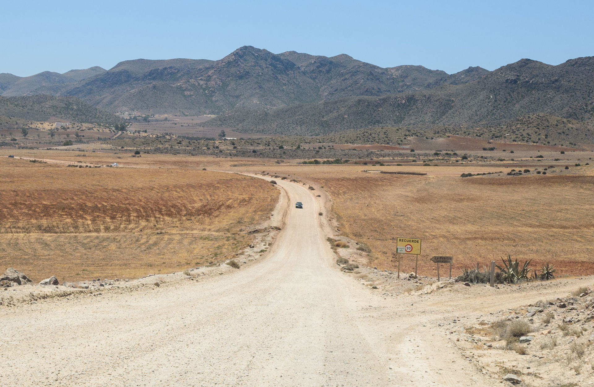El Desierto de Tabernas, más hacia el interior de la provincia, es el mayor desierto de Europa. Un paisaje peculiar y que a muchos les recordará a grandes películas del cine con sus áridas llanuras y la ausencia de vida humana masificada. En el desierto de Tabernas se rodaron decenas de películas y nombres míticos como Sergio Leone, Clint Eastwood y muchos otros aprovecharon la belleza de los espacios naturales. En la foto, un camino cercano a la playa de Mónsul.