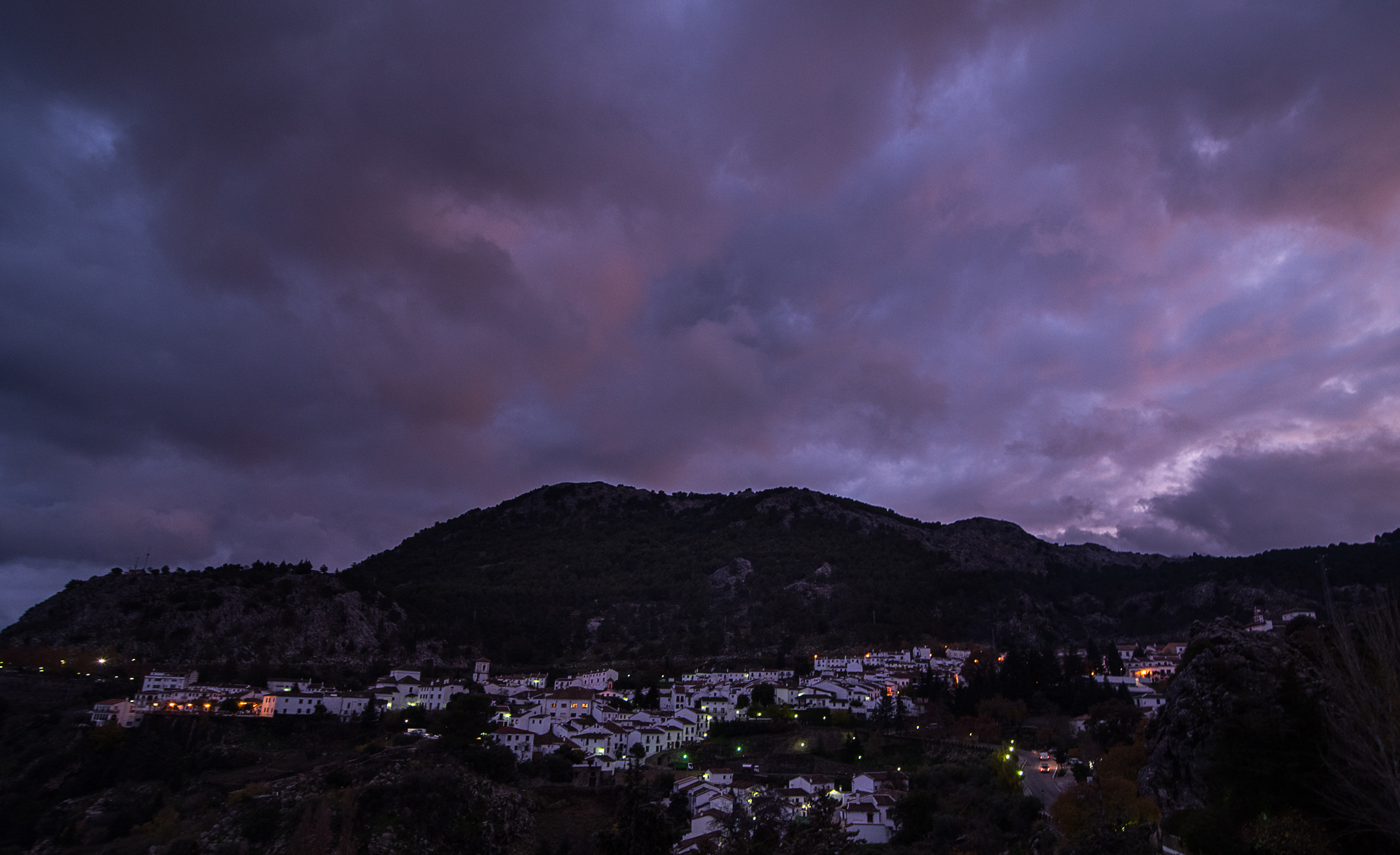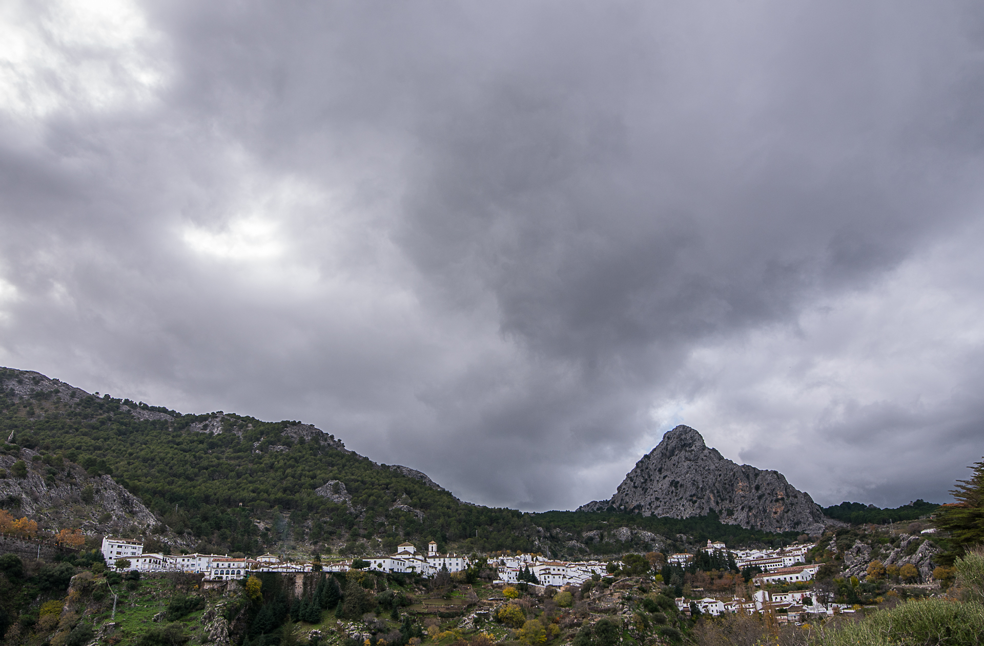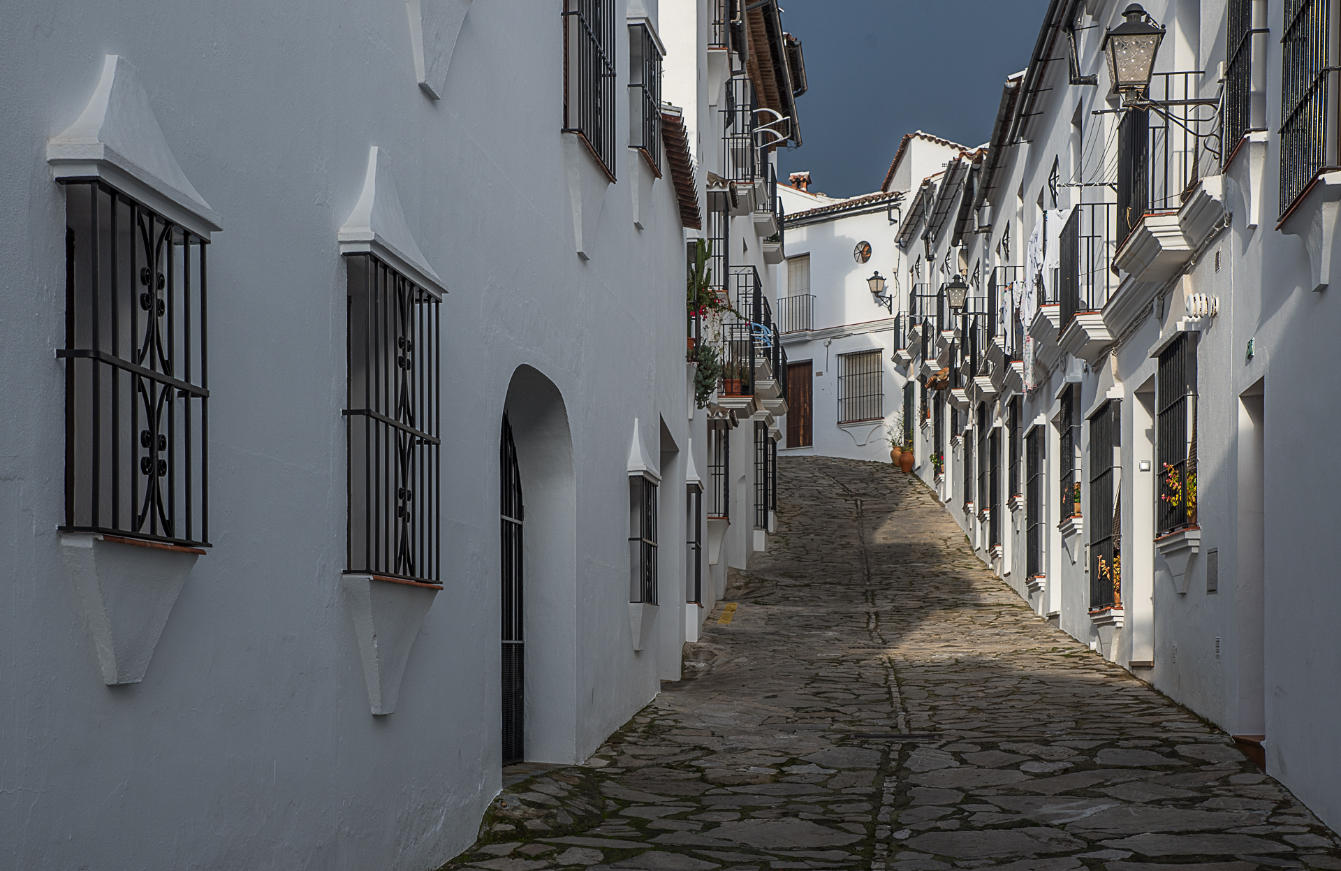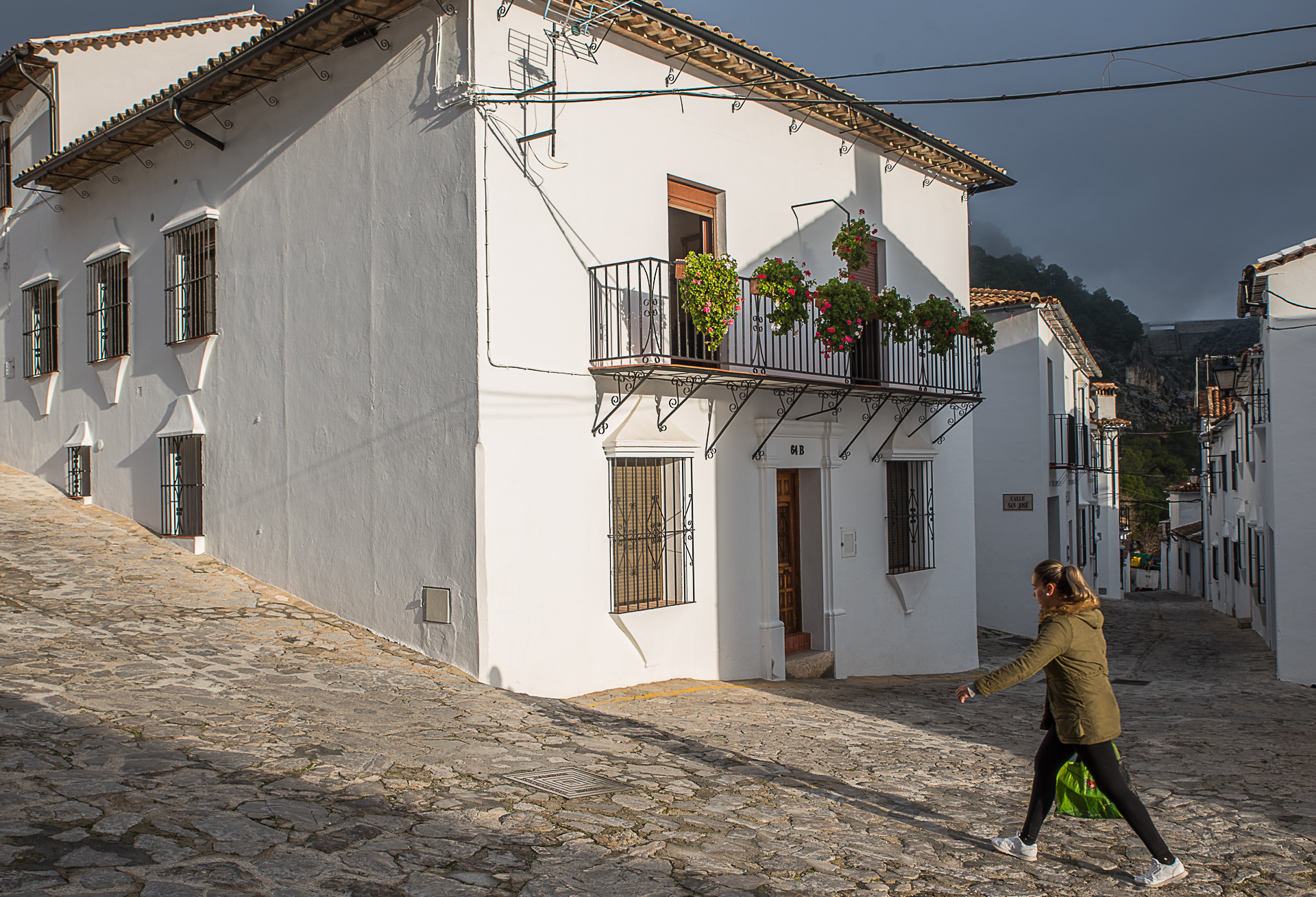 Otra calle de Grazalema, con sus paredes blancas doradas por el sol a pesar de las nubes del fondo.