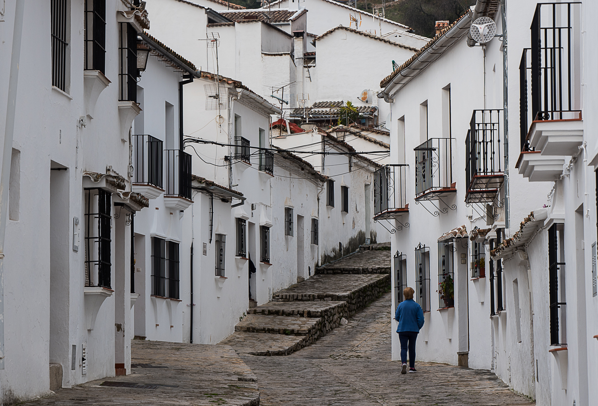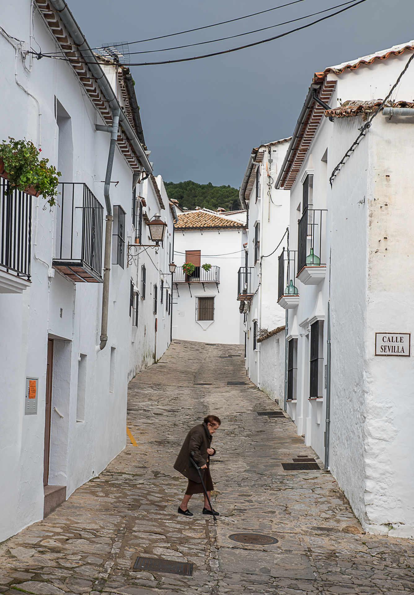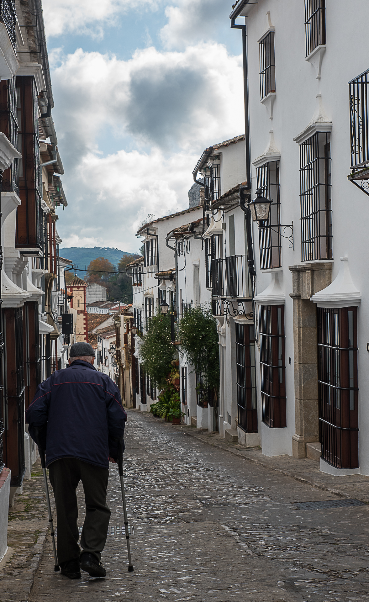 Un anciano baja hacia la plaza por una de las empredradas calles de Grazalema.