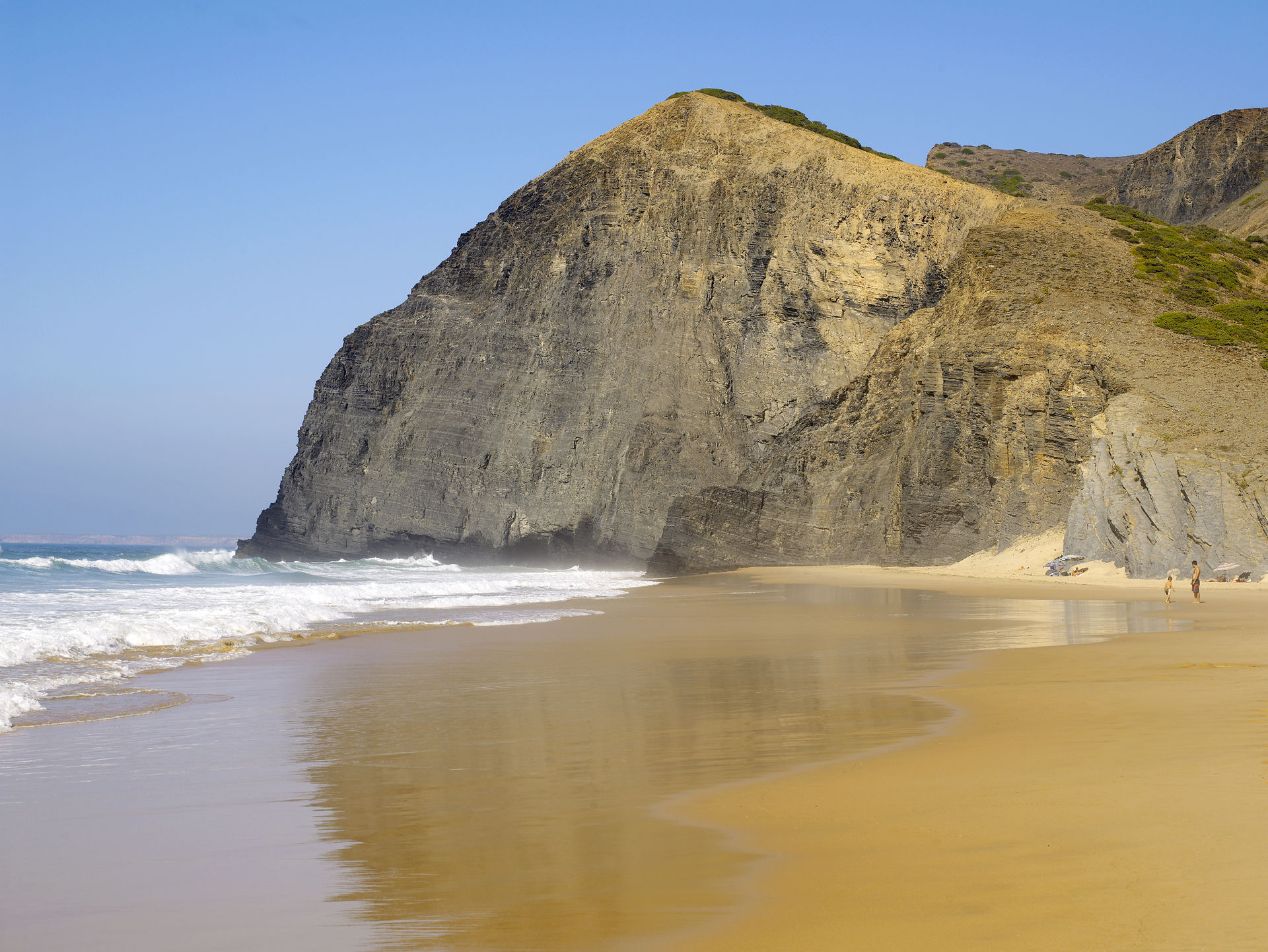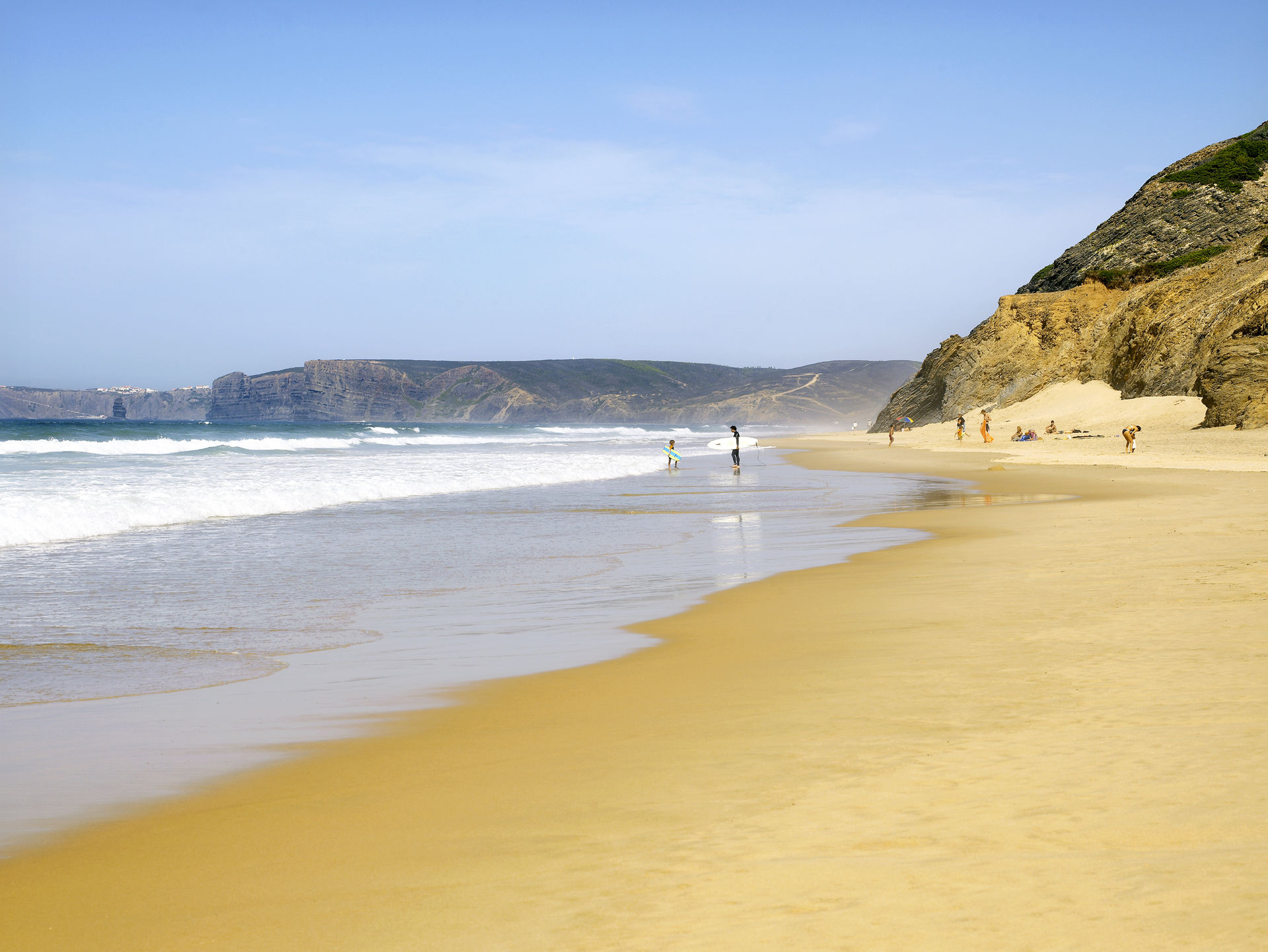 También la Praia de Bordeira suele estar bastante tranquila, con un arenal muy amplio que se extiende a lo largo de tres valles. La playa es preciosa, con su paisaje variado a base de naturaleza calcárea de colores cálidos, sus extensos campos de dunas y una laguna ocasional en la Ribeira de Bordeira con aguas templadas, en las que, a veces, se puede ver nadando nutrias.