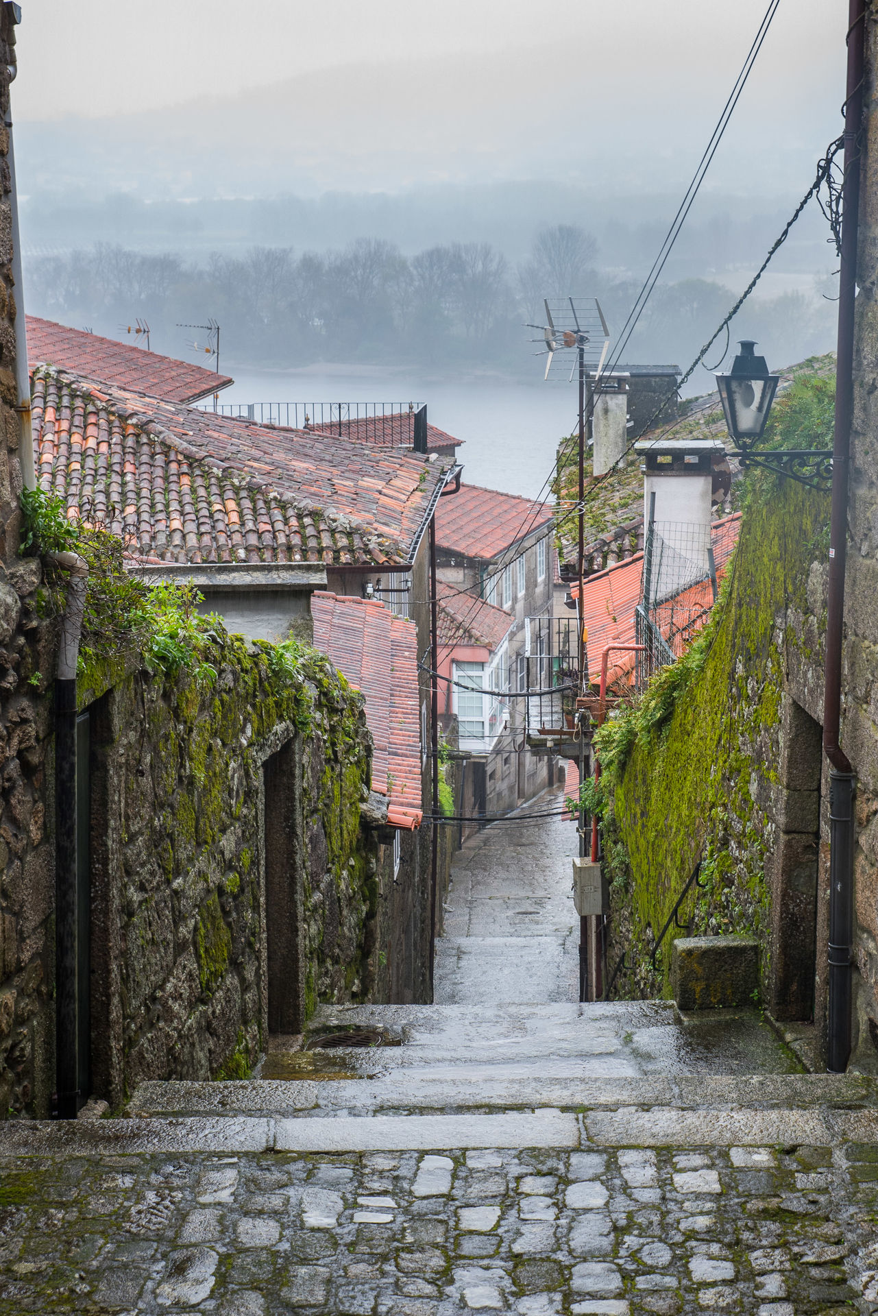 Una de las calles de Tuy que cae hasta el río, en una mañana lluviosa.