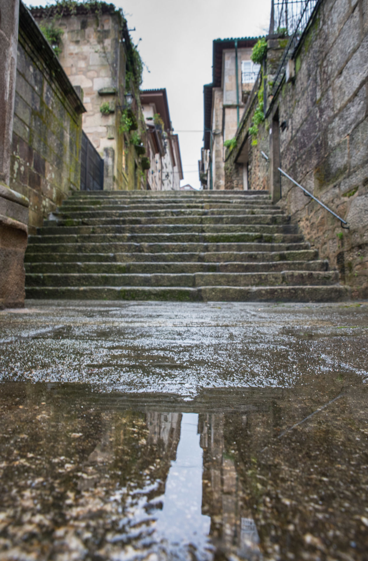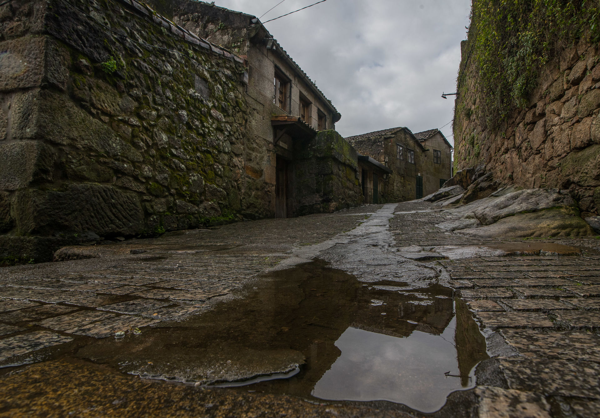 Una de las calles del casco viejo de Tuy reflejada en la lluvia.