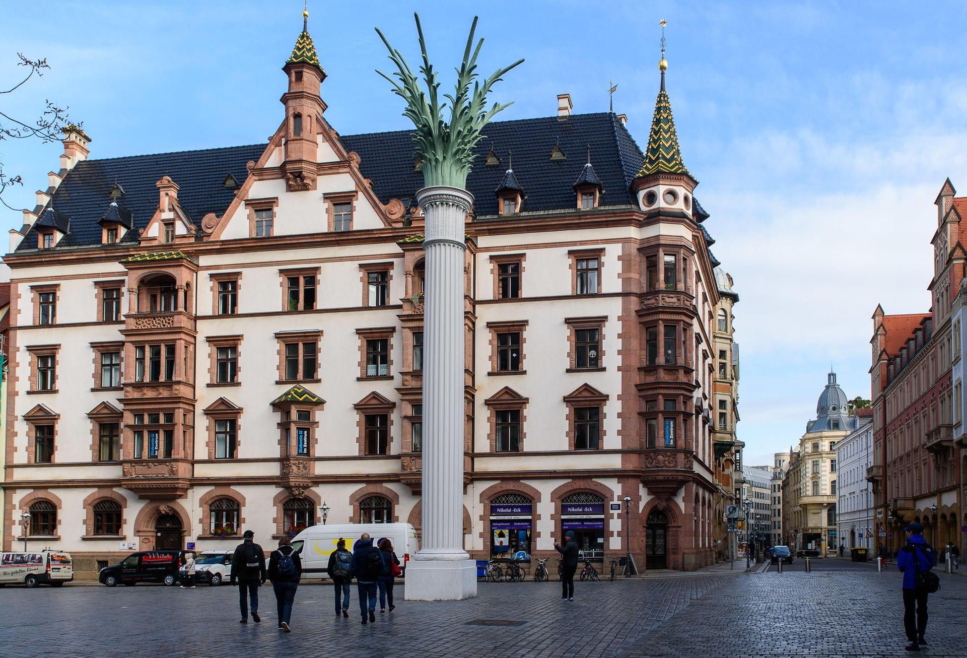 Una calle de centro histórico de Leipzig con la columna que es un monumento a la revolución pacífica que acabó con el régimen comunista en 1989.