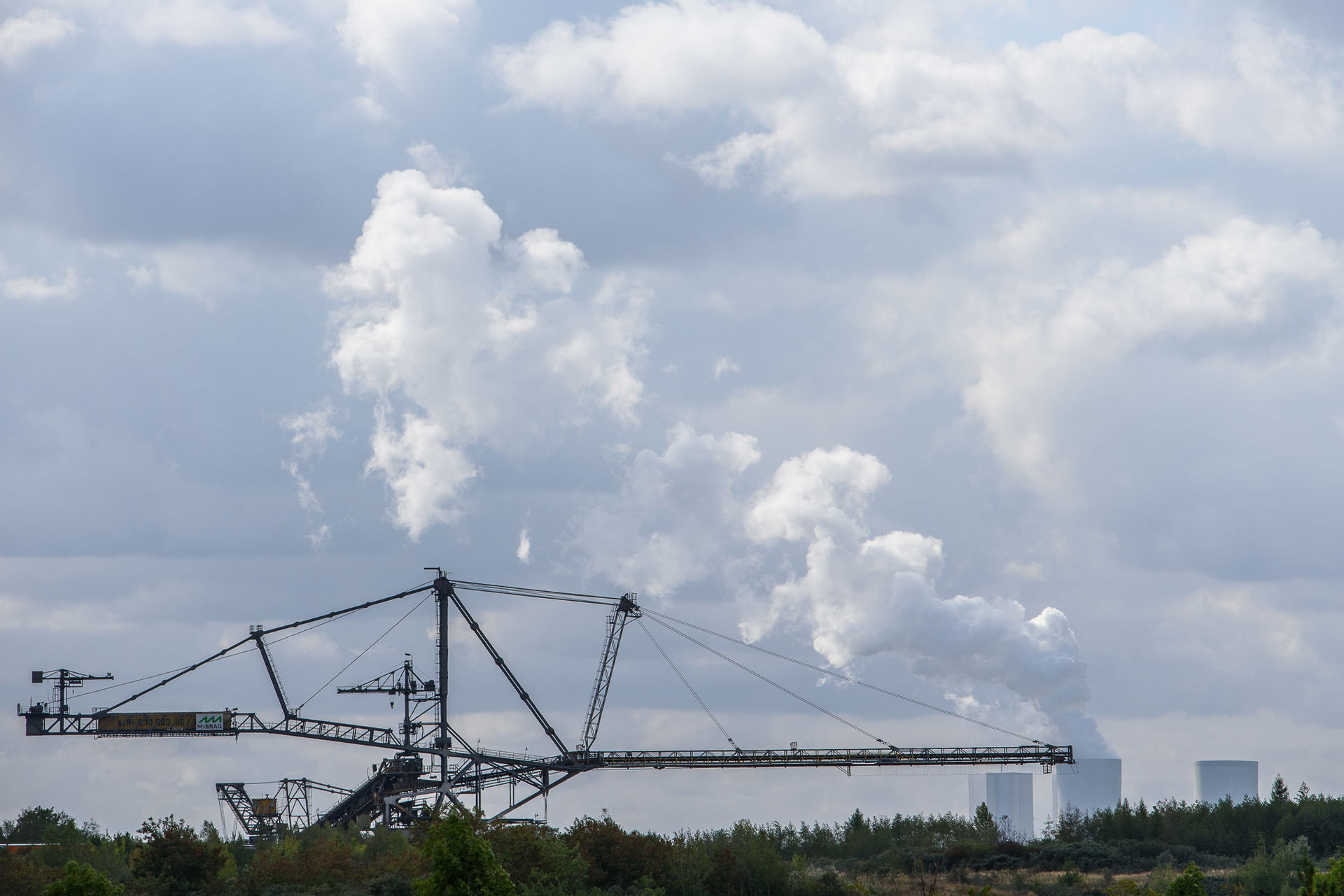 Gigantesca maquinaria de minería y, al fondo, una central térmica que aún quema el carbón de la zona pero que es una de las más limpias del mundo.