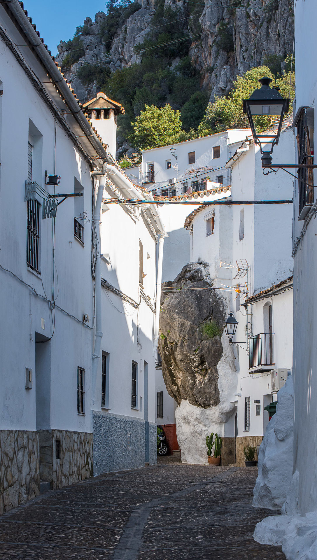 Una enorme roca irrumpe amenazante en una de las preciosas calles del barrio alto de Ubrique.