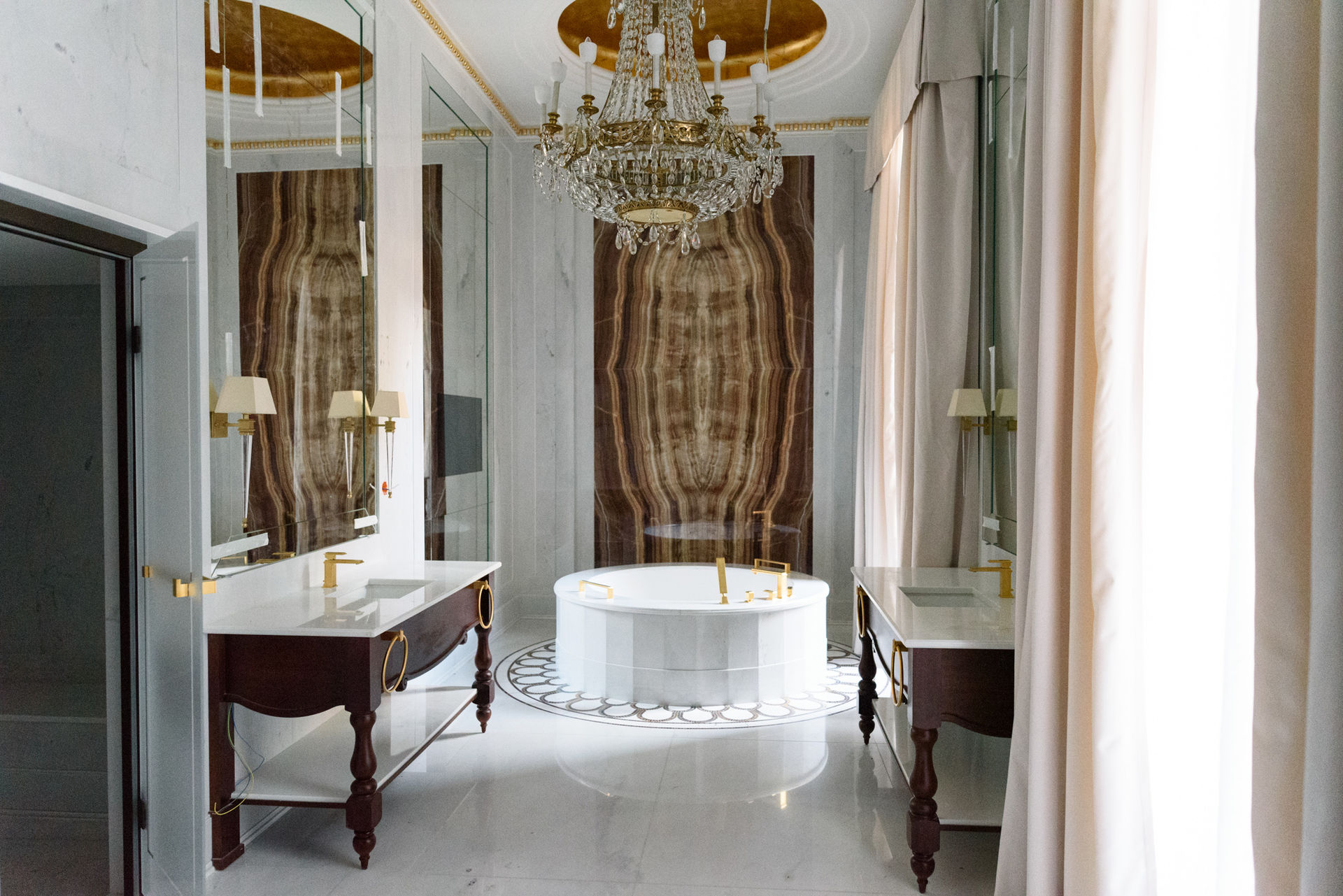Tras una obra de 6 años y una inversión de 608 millones en el edificio, la cadena canadiense Four Seasons debuta en España con alrededor de 50 habitaciones que pronto serán 200, las circunstancias de la pandemia mandan. La más espectacular, la Royal Suite, ubicada en lo que era el despacho del presidente de Banesto, Mario Conde. Su precio: 20.000 euros la noche. Destaca su baño, hecho en piedra Onyx viola. Un verdadero lujo.