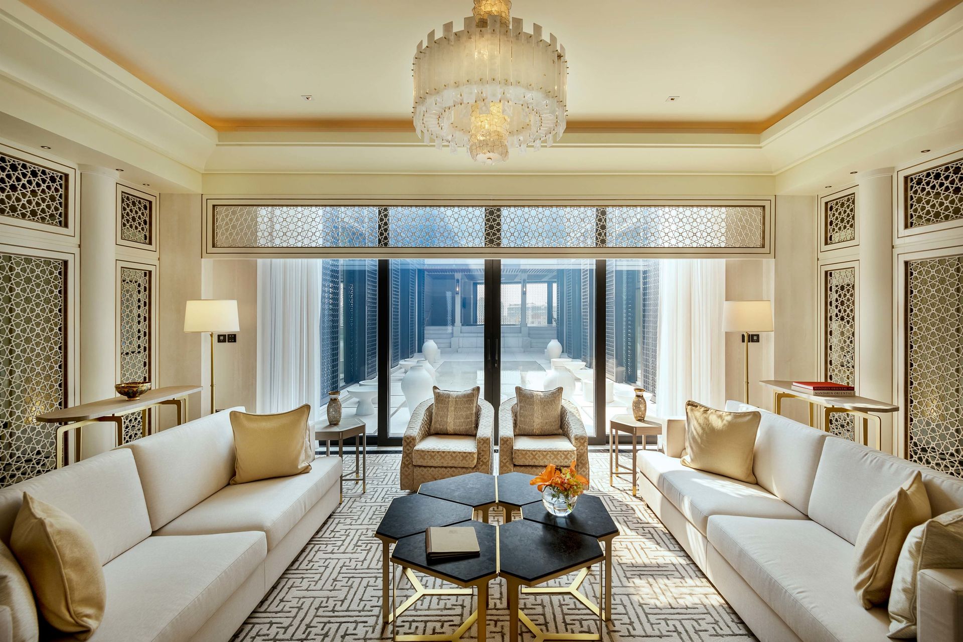 El hotel Mandarin Oriental Jumeira Dubái y su la palaciega Royal Penthouse. Una suite aislada en el último piso del lujoso resort, frente a la playa. Un ascensor privado lleva a los huéspedes a su refugio de 850 metros cuadrados con amplias vistas sobre el Golfo Arábigo.