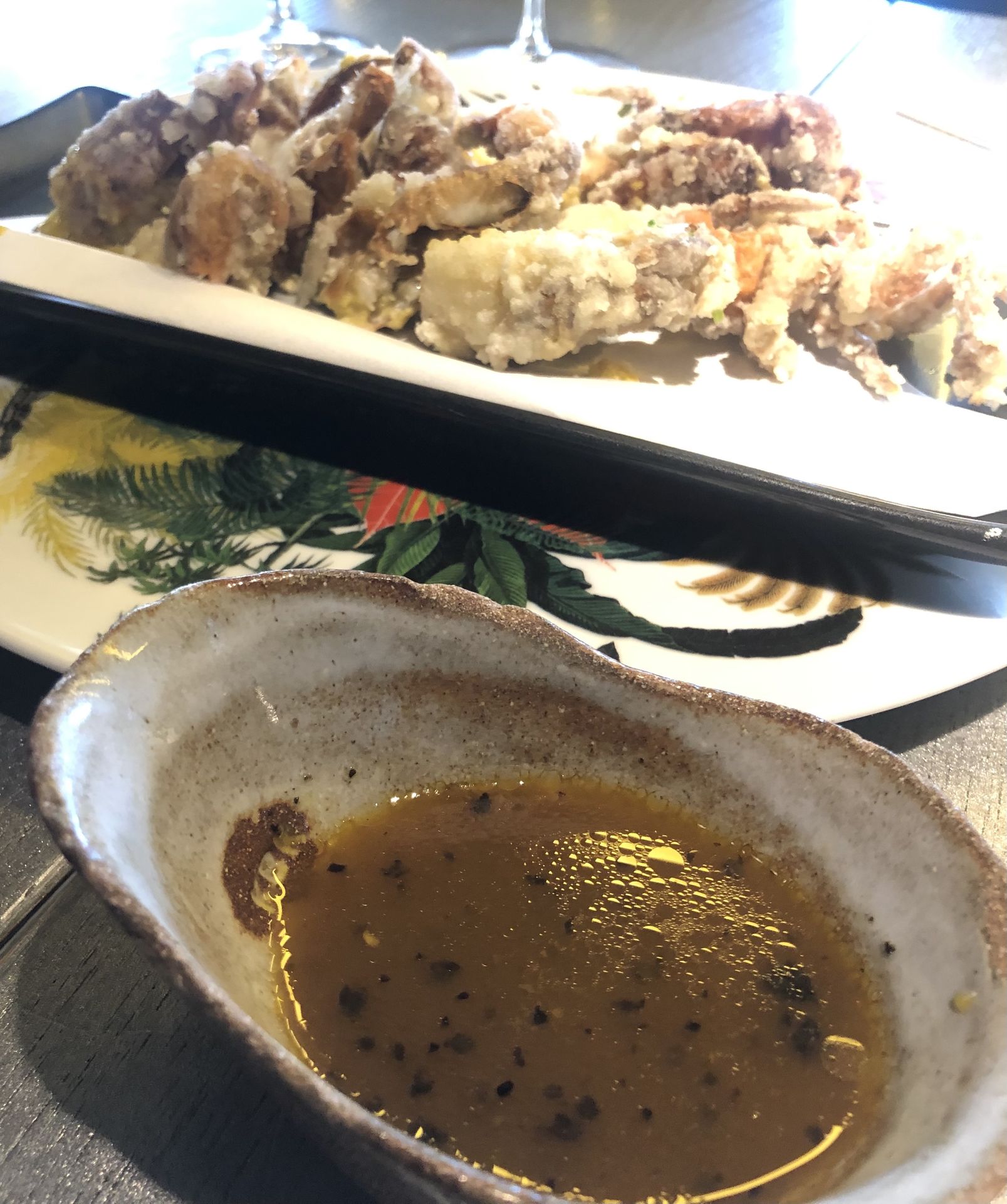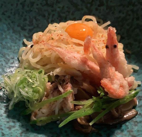 Cangrejo de concha blanda frito en almidón de patata, con salsa tentsuyu, yema de corral y trufa, después de emulsionar la yema en la salsa.
