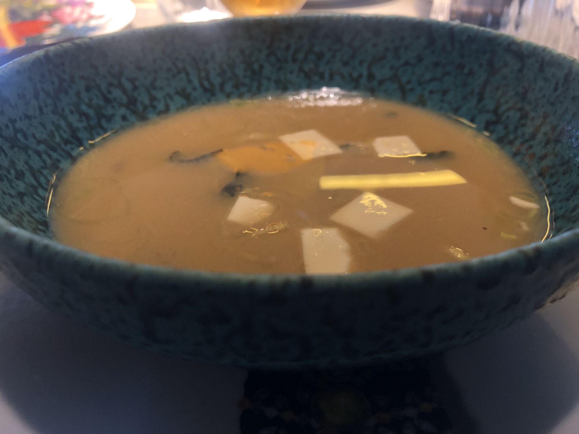Sopa miso, un clásico japonés, con cebolleta, alga wakame y tofu.