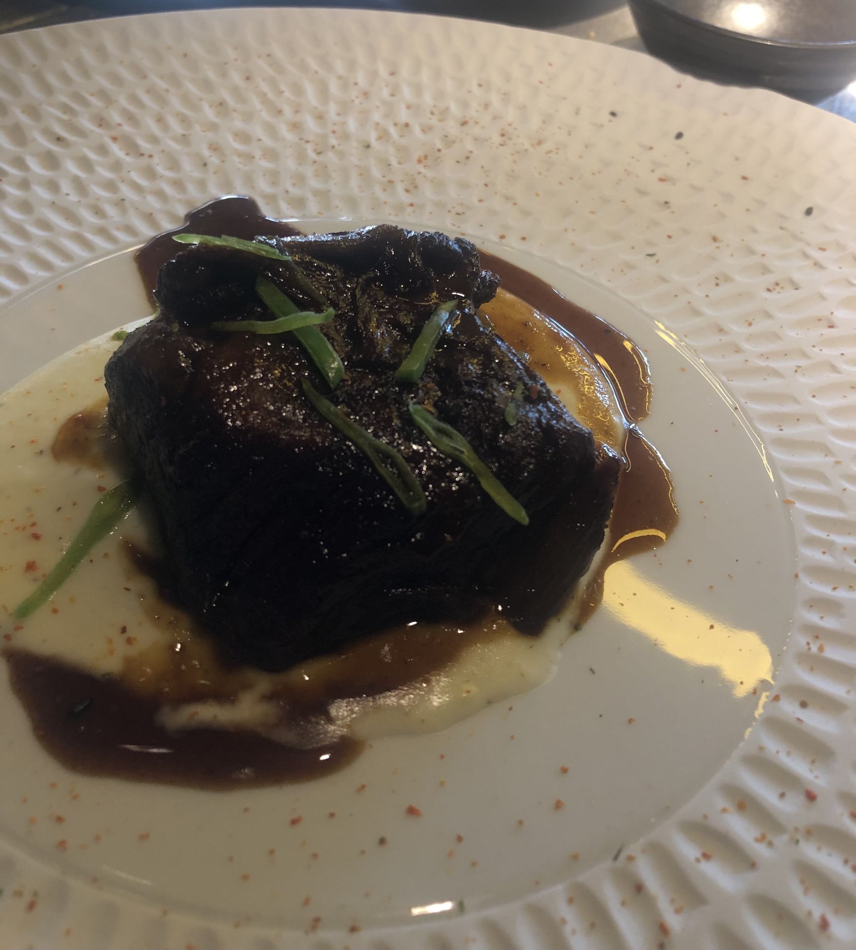 Taco de vaca vieja a la gallega y parmentier con rábano picante y puré de temayaki kinnei, jengibre y jalapeño.