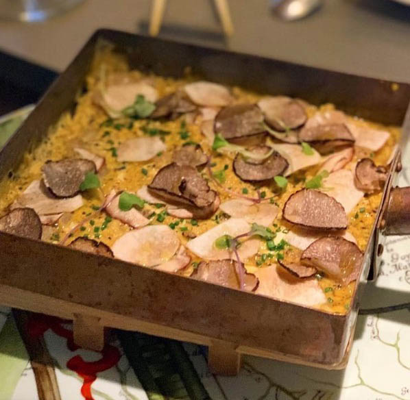 Cangrejo de concha blanda frito en almidón de patata, con salsa tentsuyu, yema de corral y trufa, antes de emulsionar la yema en la salsa.
