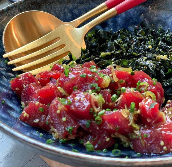 Tataki de chutoro mediterráneo con piñones y tierra de olivas negras.