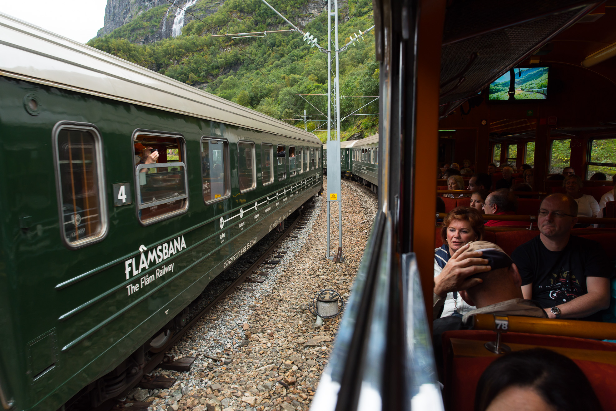 En el transcurso de aproximadamente dos horas, el tren viaja desde Flåm, un pequeño pueblo situado a nivel del mar junto al fiordo de Sogn, hasta lo alto de la estación de montaña de Myrdal, a 867 metros por encima del nivel del mar.