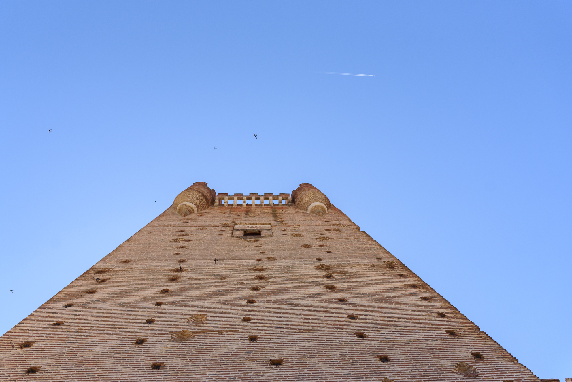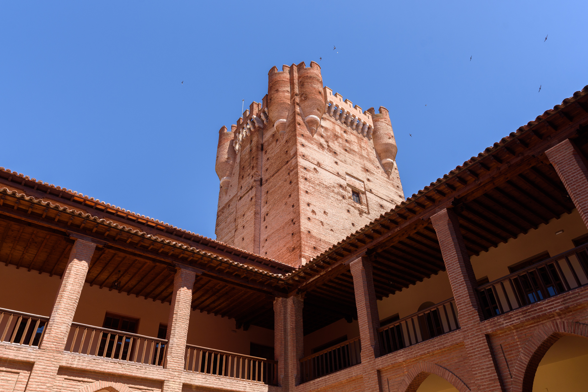 Una vista desde abajo de la imponente Torre del Homenaje del castillo de la Mota, en Medina del Campo.