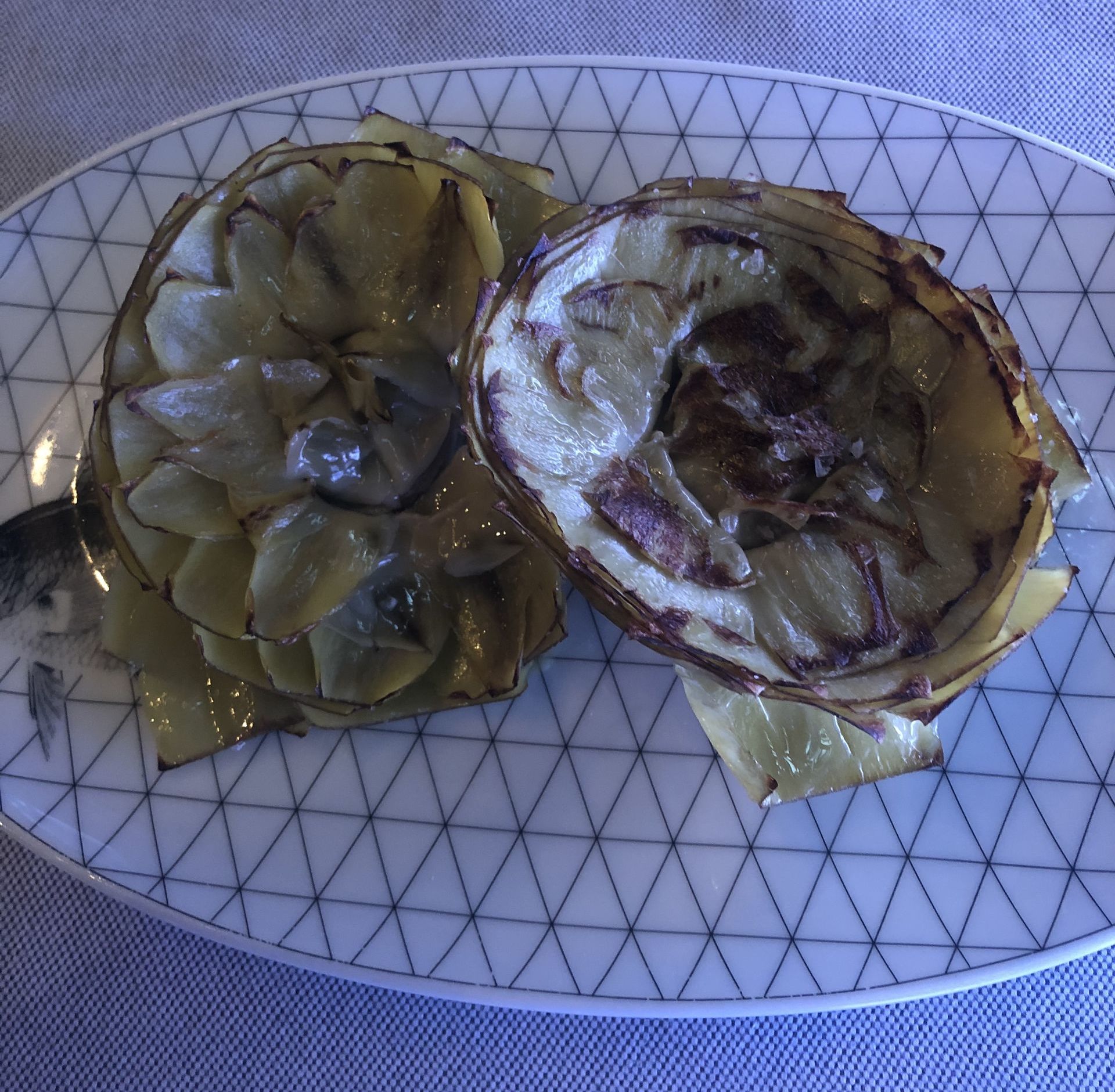 Detalle del rodaballo a la brasa estilo Guetaria y al fondo guarnición de pimientos confitados.