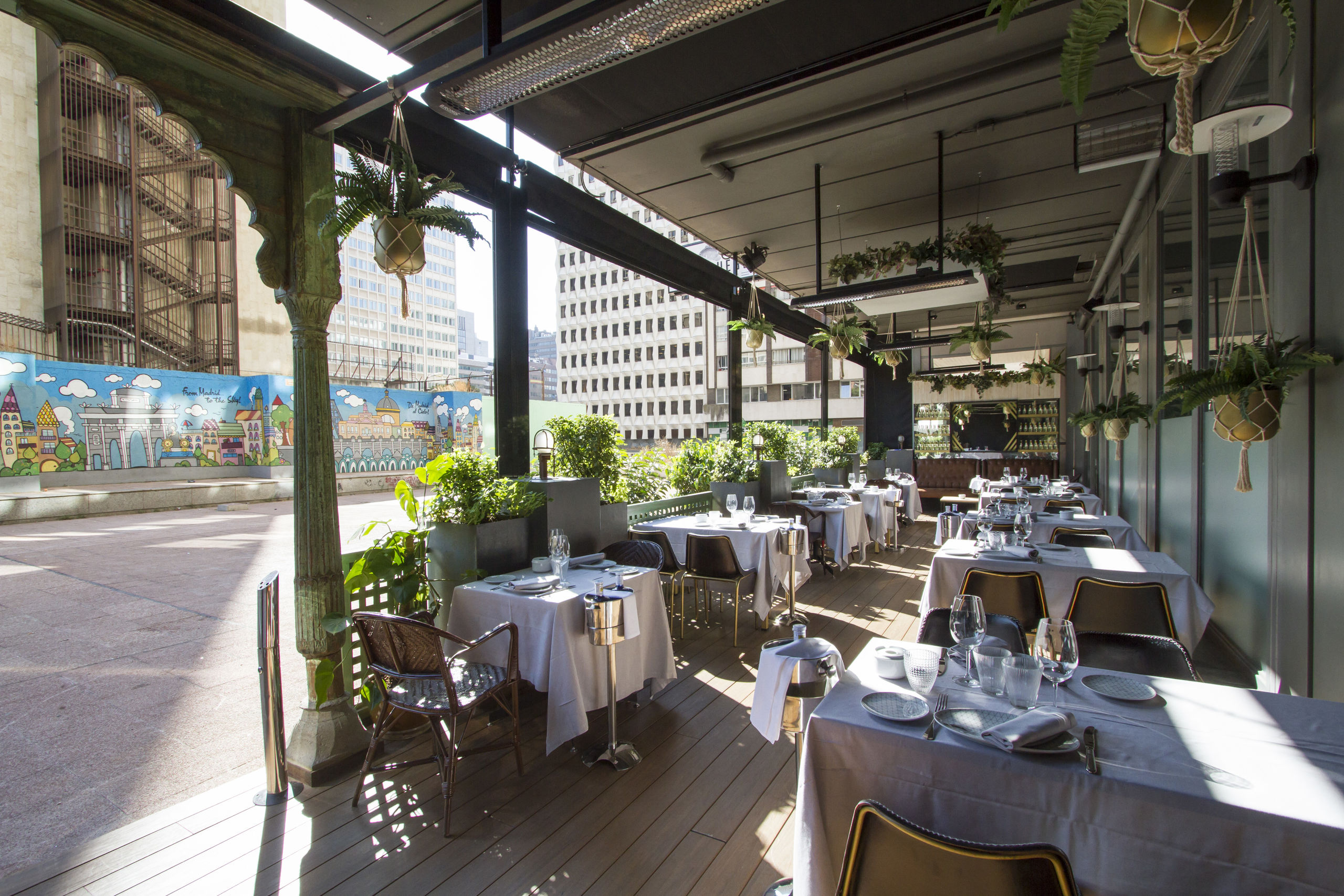 La terraza del restaurante Pez Fuego, cubierta y con estufas, aunque también puedes disfrutar del sol.