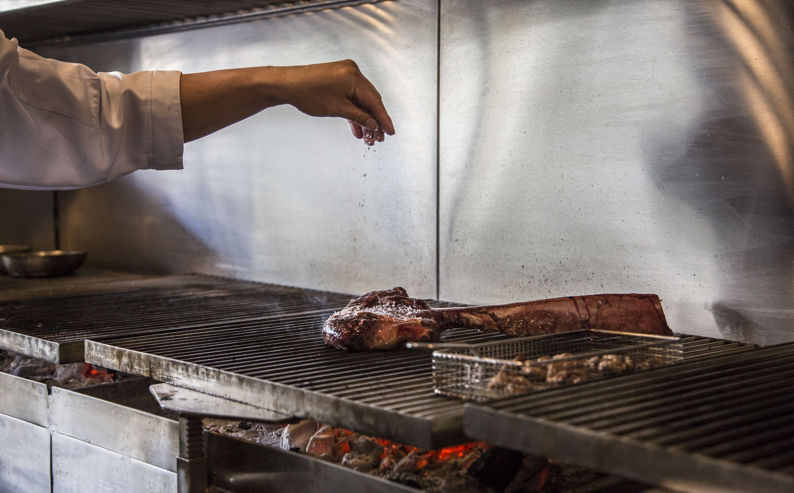 El chef Francisco Martínez echa sal a este Tomahawk steak de carne roja a la parrilla.