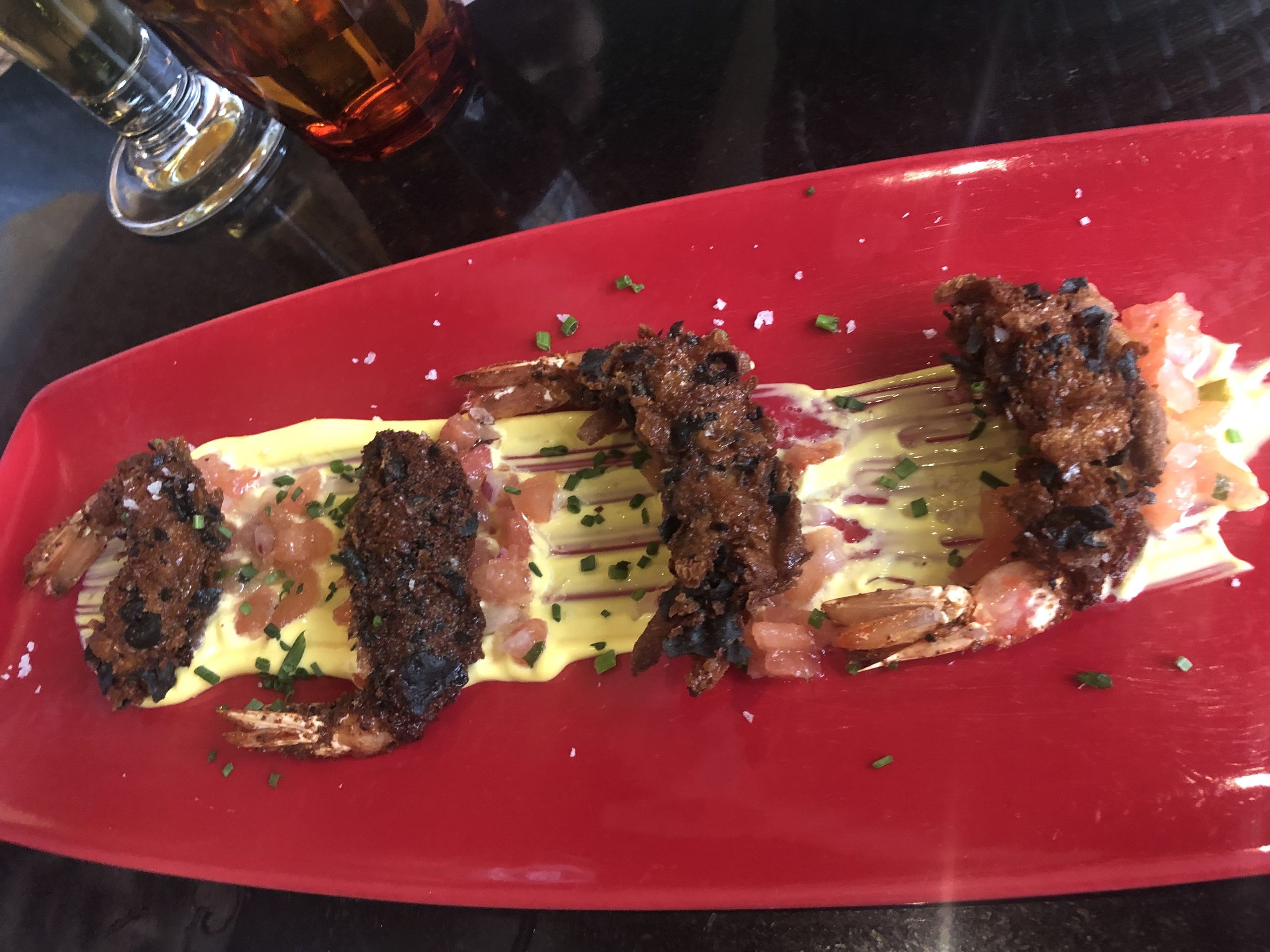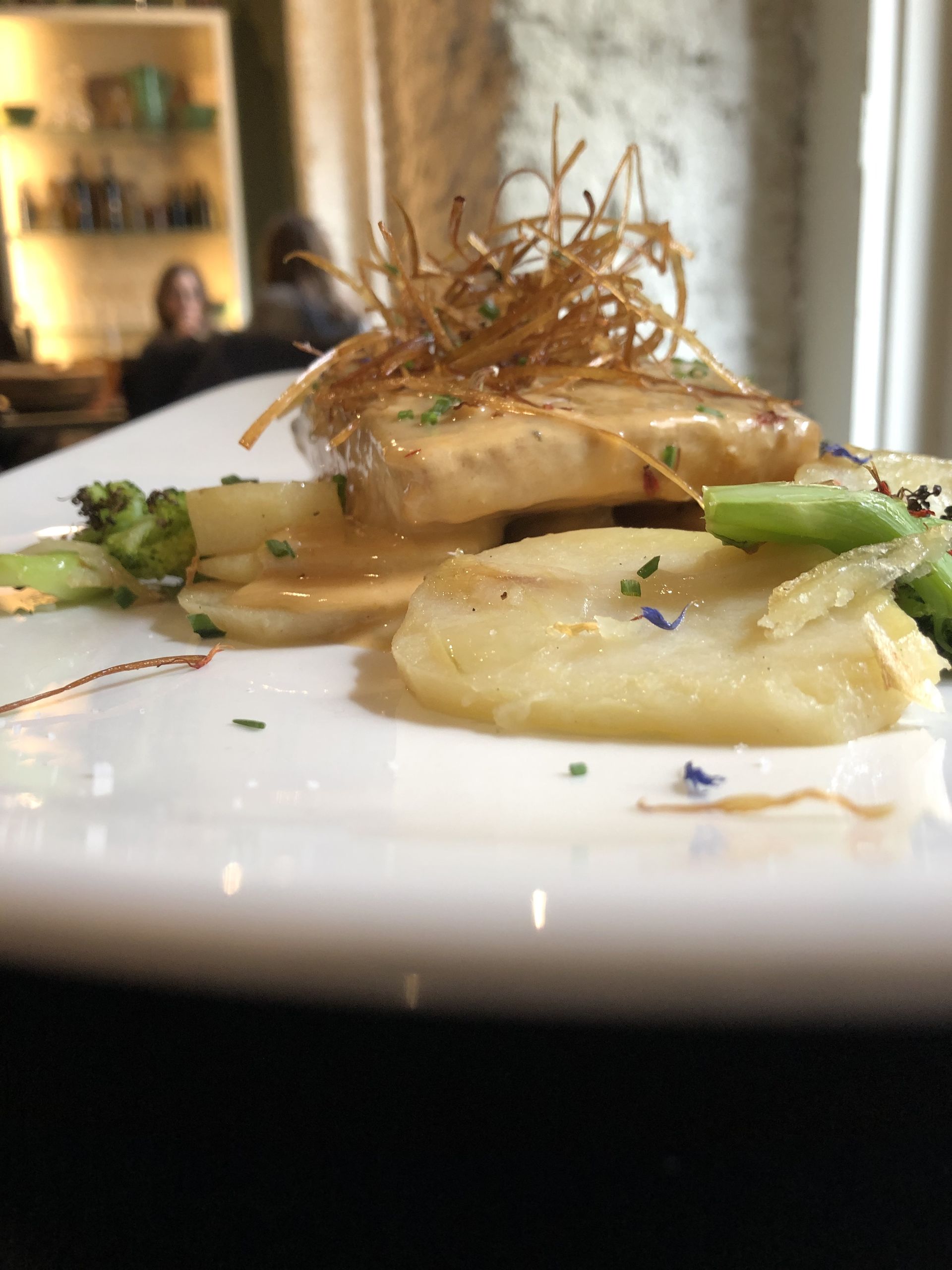 Corvina con patatas asadas, puerro frito, brócoli y emulsión de bisque.