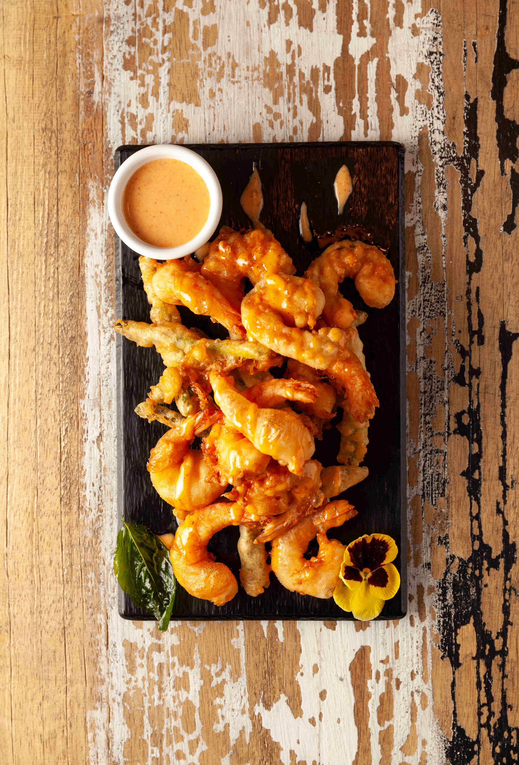 Langostinos y trigueros en crujiente tempura con salsa kimchi.