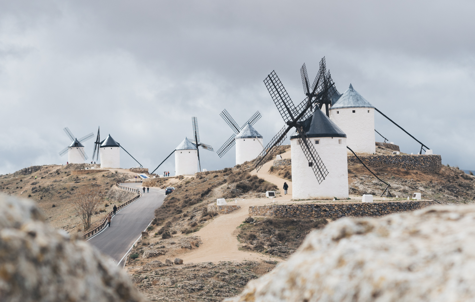 Consuegra es un pueblo de la provincia de Toledo, en Castilla-La Mancha que posee una de las estampas más conocidas de las postales típicas de España. Los molinos de viento de Consuegra fueron construidos en la primera mitad del siglo XIX, se llegaron a contabilizar hasta 10. Está situado a poco más de una hora desde Madrid.