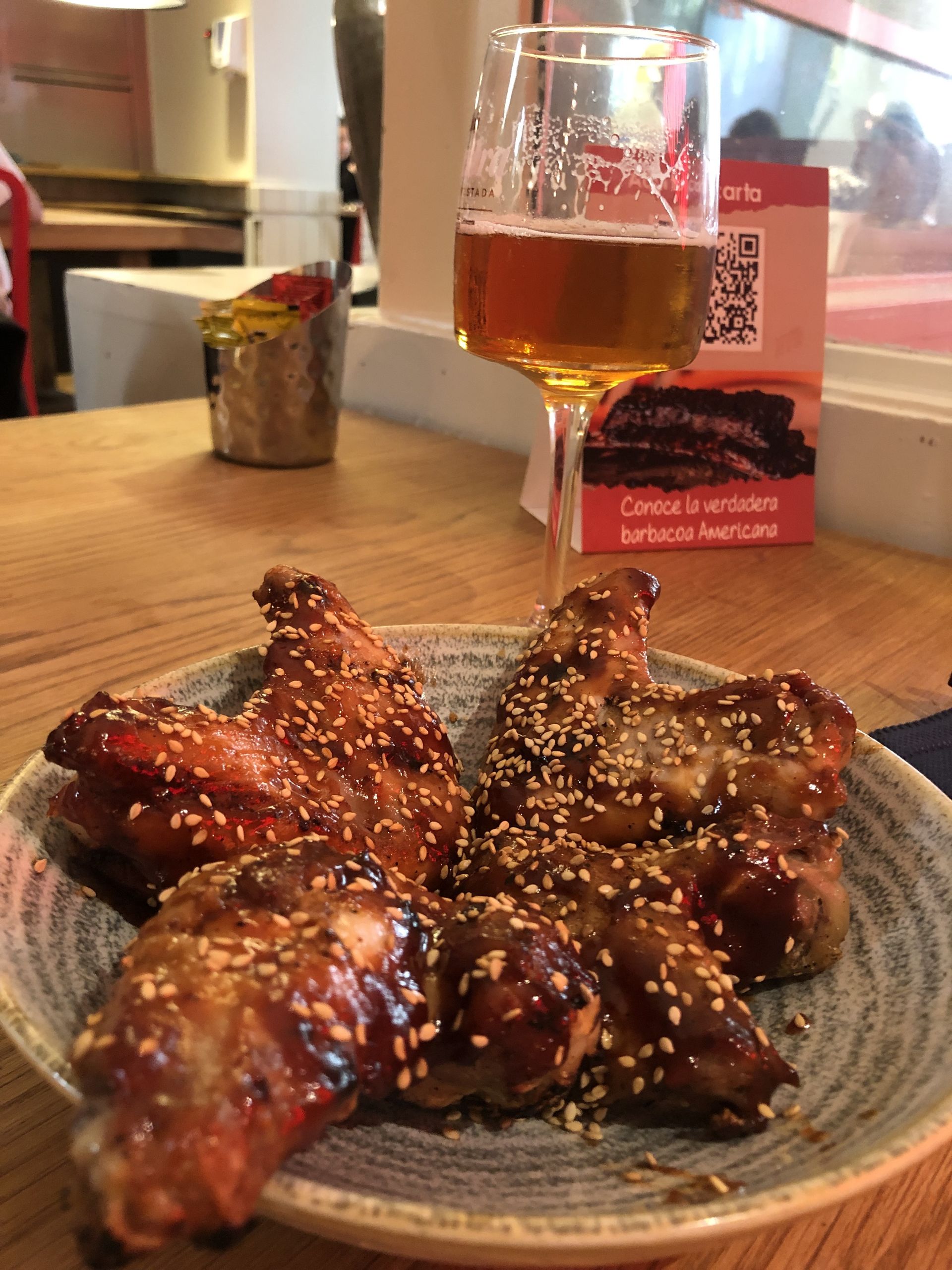 Deliciosas alitas asadas lentamente a la brasa, bañadas en salsa bbq o salsa búfalo picante.