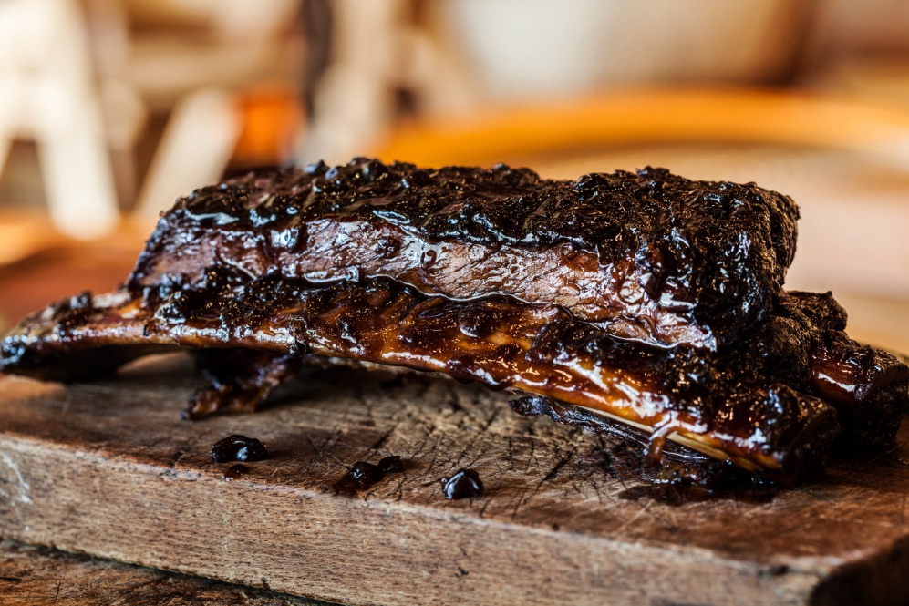 Jugosa y tierna costilla de vaca, ahumada durante 8 horas, glaseada sobre la parrilla con salsa barbacoa o bourbon.