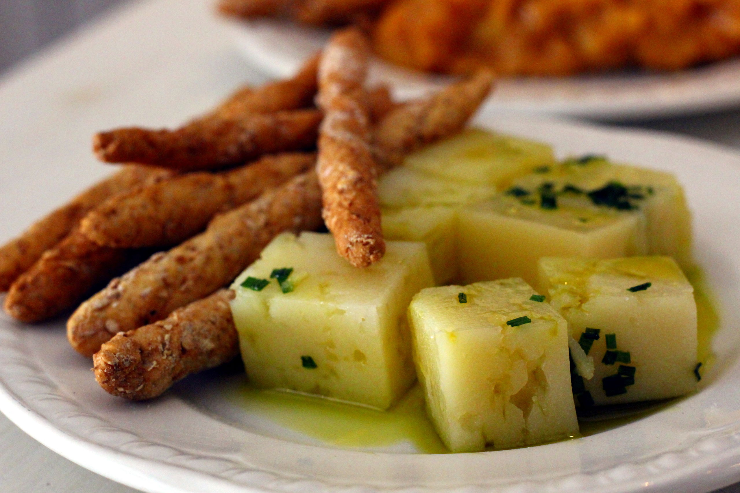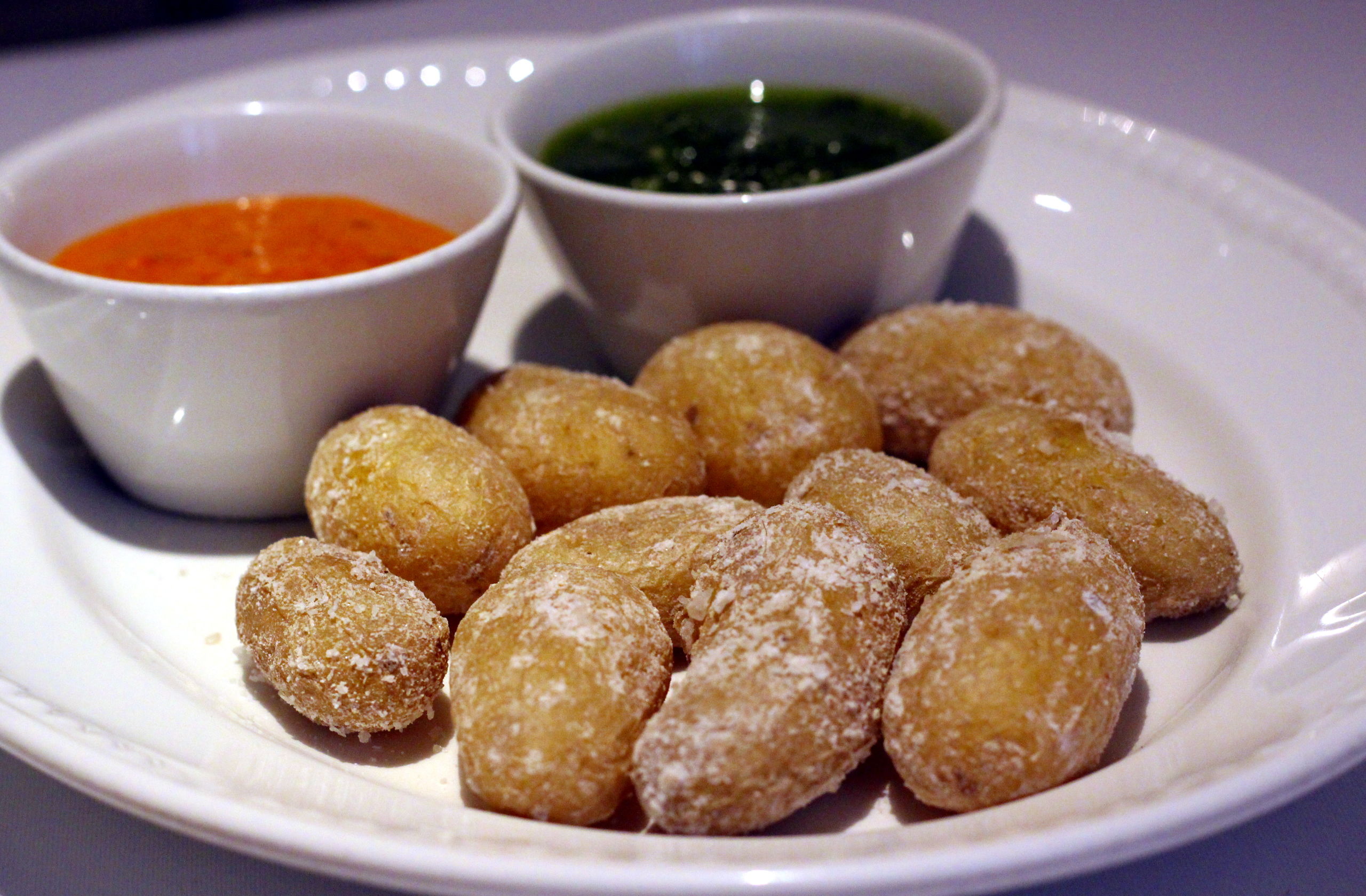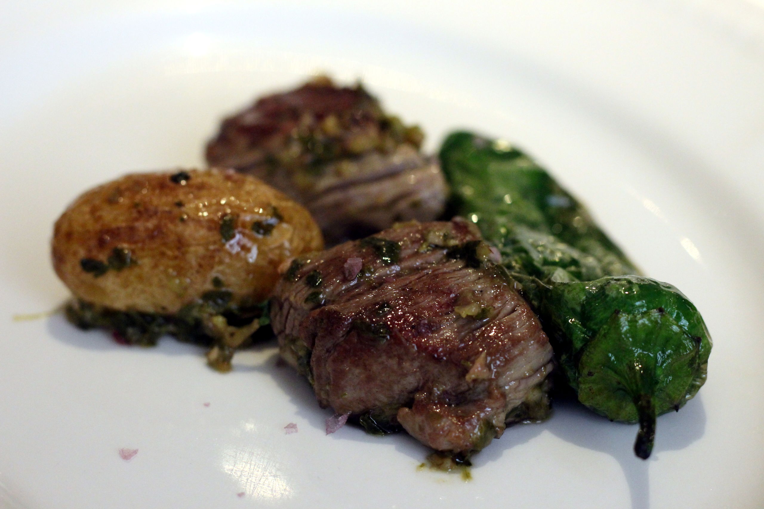 Dados de Solomillo con chimichurri, papas arrugadas y pimientos de Guernica.