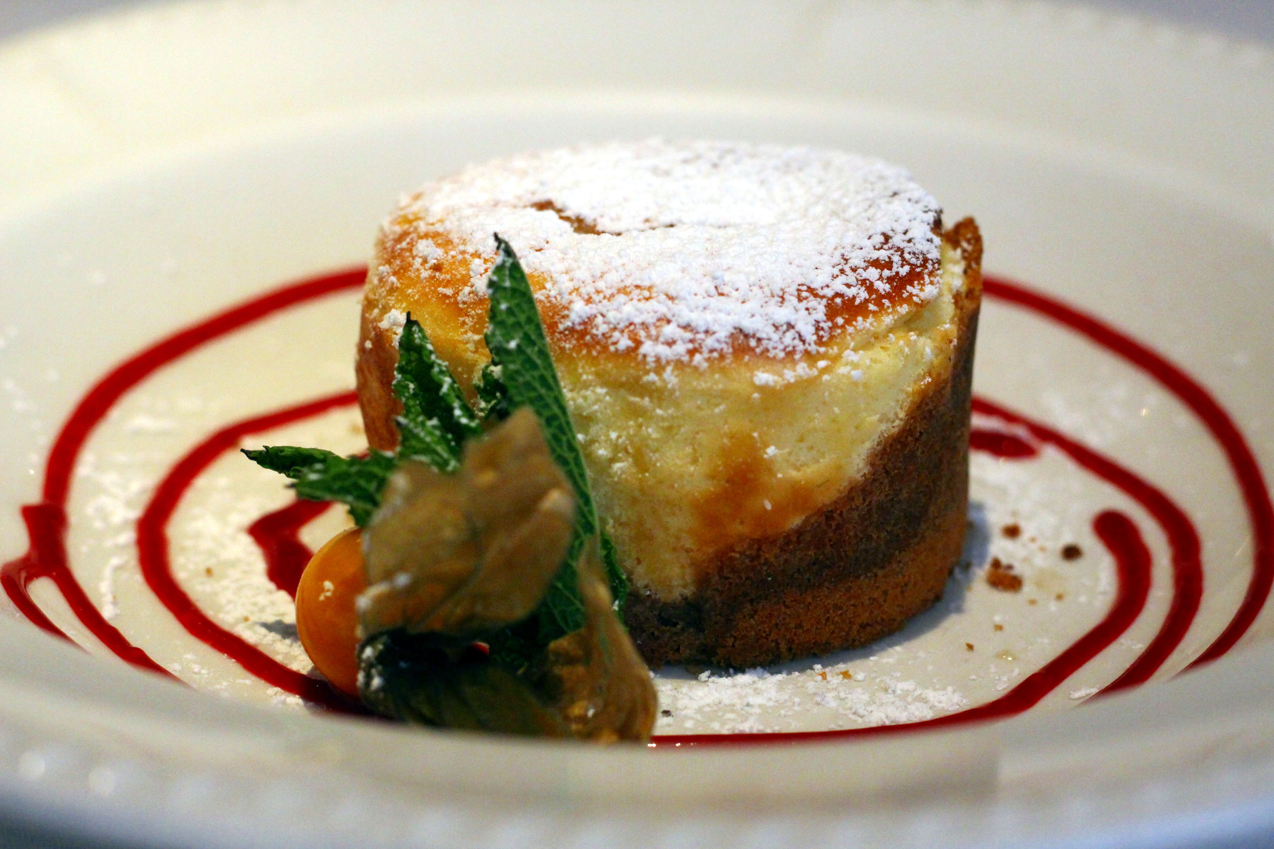 Tarta de queso horneada al momento con un toque de miel y fruta de la pasión, con un tiempo de espera de 15 minutos.