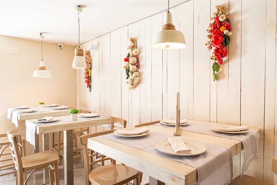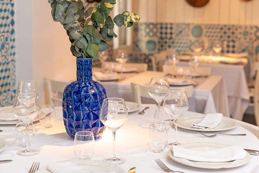 En el comedor de Puerto Lagasca destaca la decoración típica mediterránea con blancos y azules.