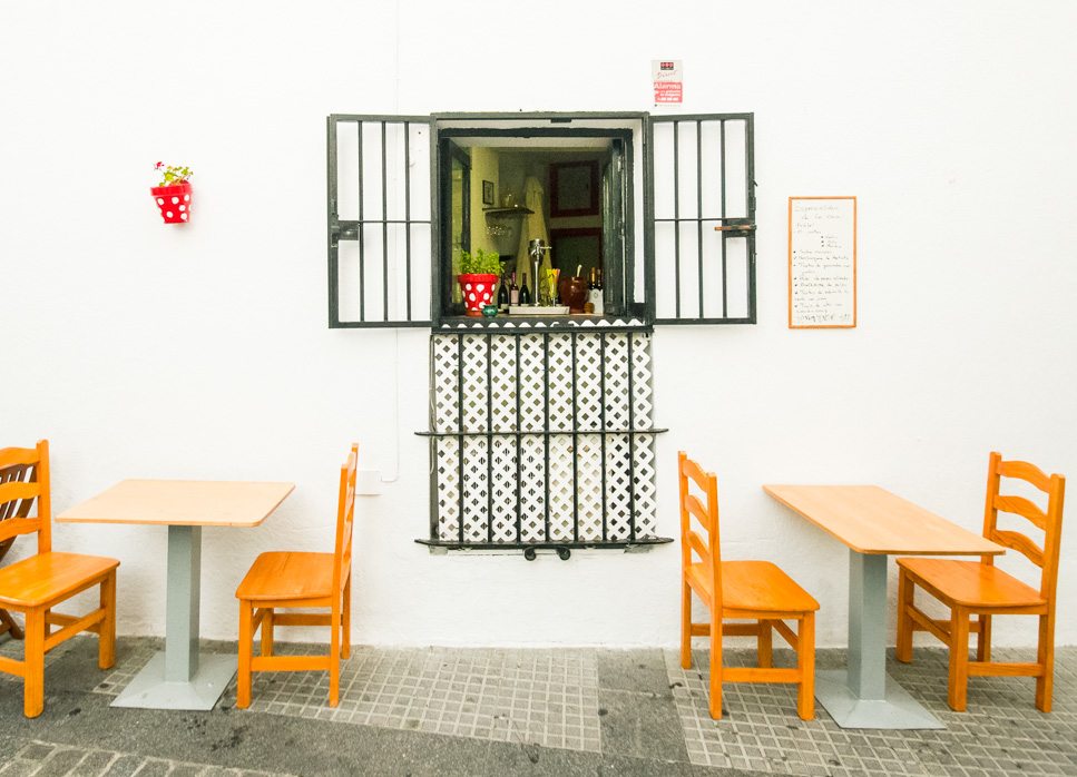 Sus paredes blancas contrastan con la gran cantidad de flores y macetas que engalanan y adornan sus balcones y puertas como la de este bar.