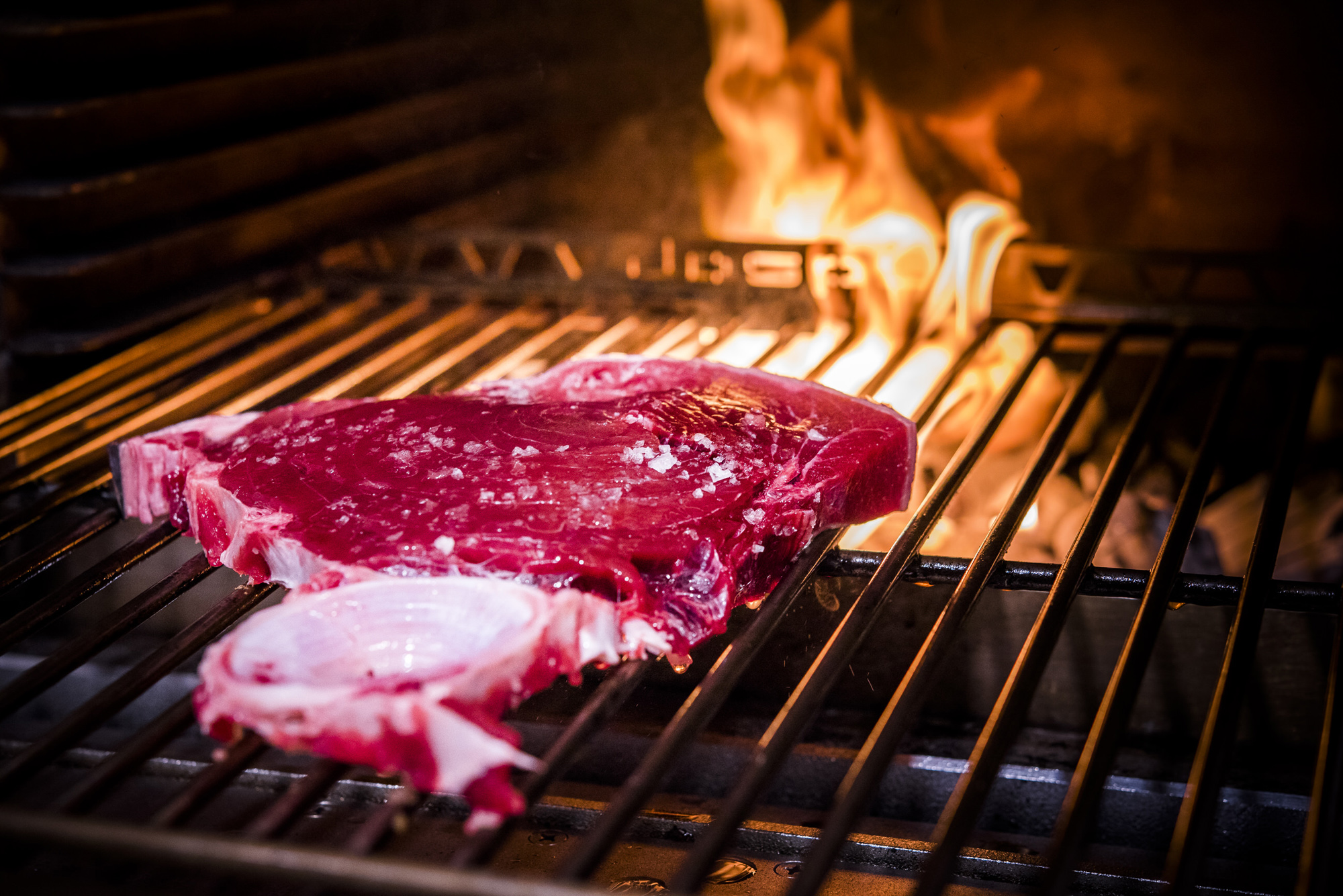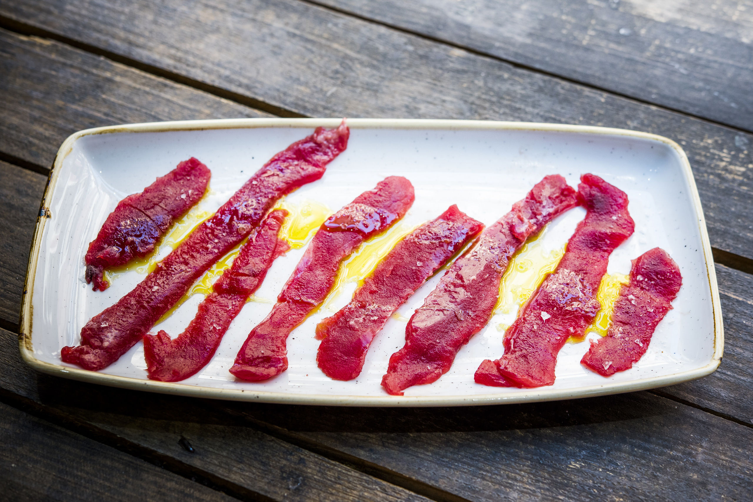 Lomo de atún rojo a la parrilla sobre salsa de tomate casera, huevo campero y patatas paja. Un guiño al restaurante Antonio de Zahara de los Atunes. (Antes)