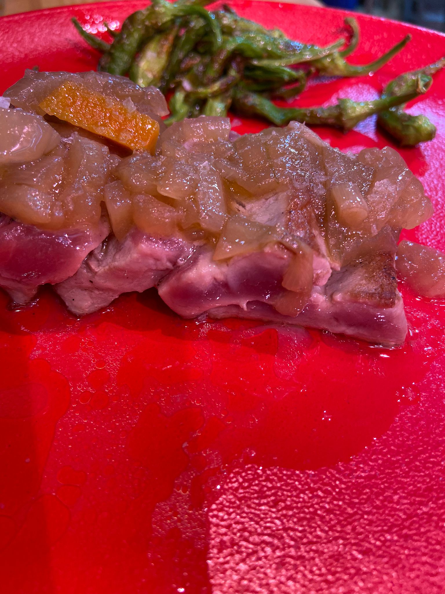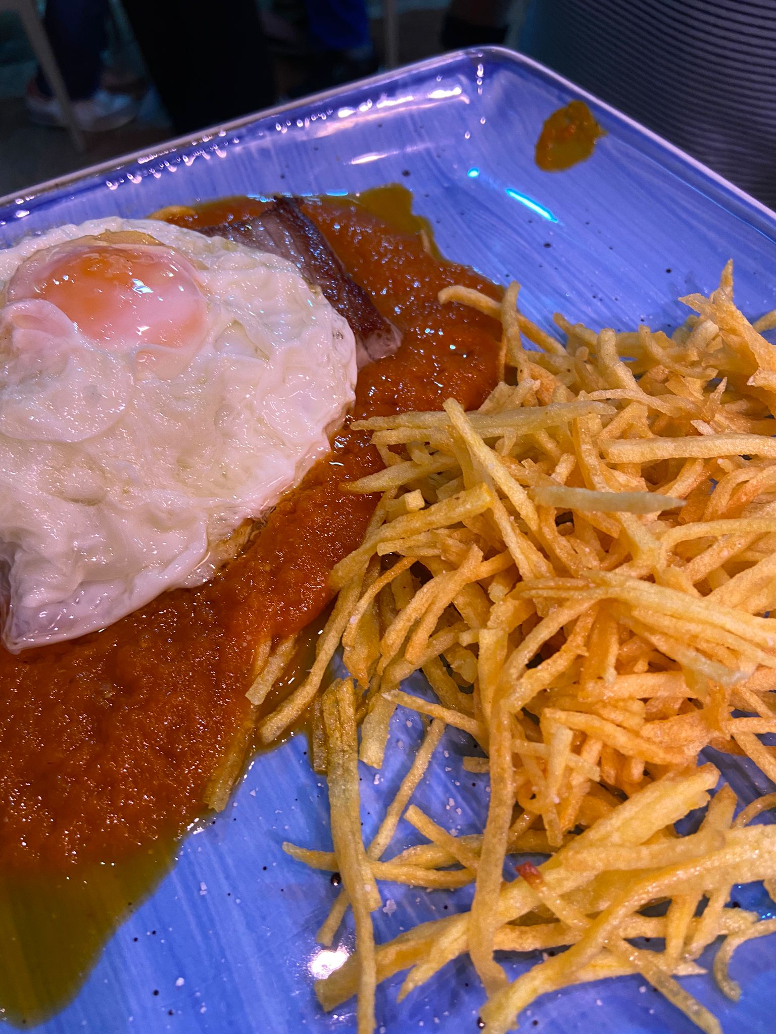 Lomo de atún rojo a la parrilla sobre salsa de tomate casera, huevo campero y patatas paja. Un guiño al restaurante Antonio de Zahara de los Atunes. (Después)