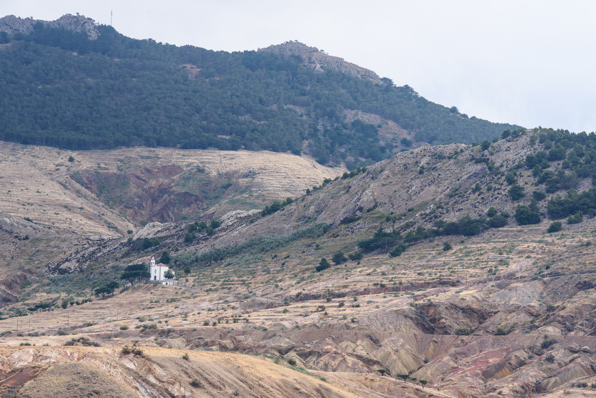 El terreno árido y seco de Porto Santo, donde la vegetación es pobre como consecuencia de su falta de montañas, al contrario que Madeira. En la foto, la Capela de Nossa Senhora da Graça.