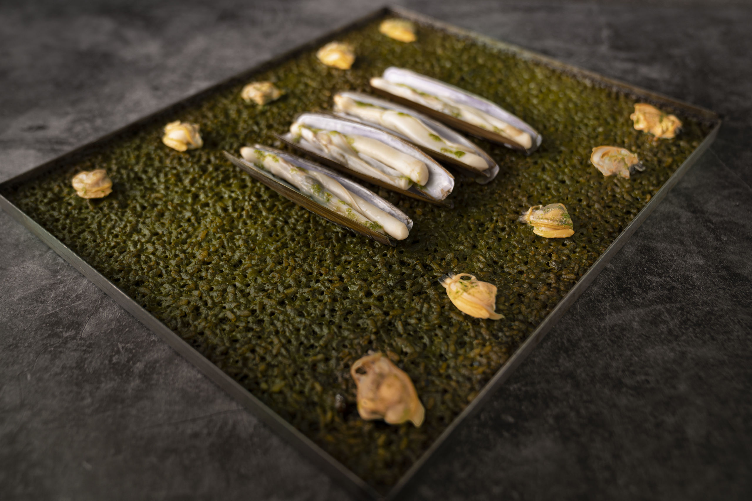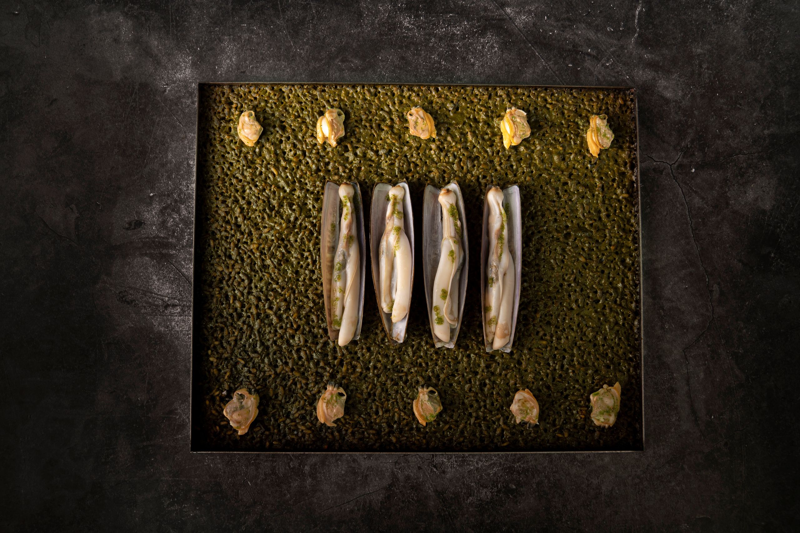 Mar al cuadrado, directo de mar, fumet verde con navajas y almejas.