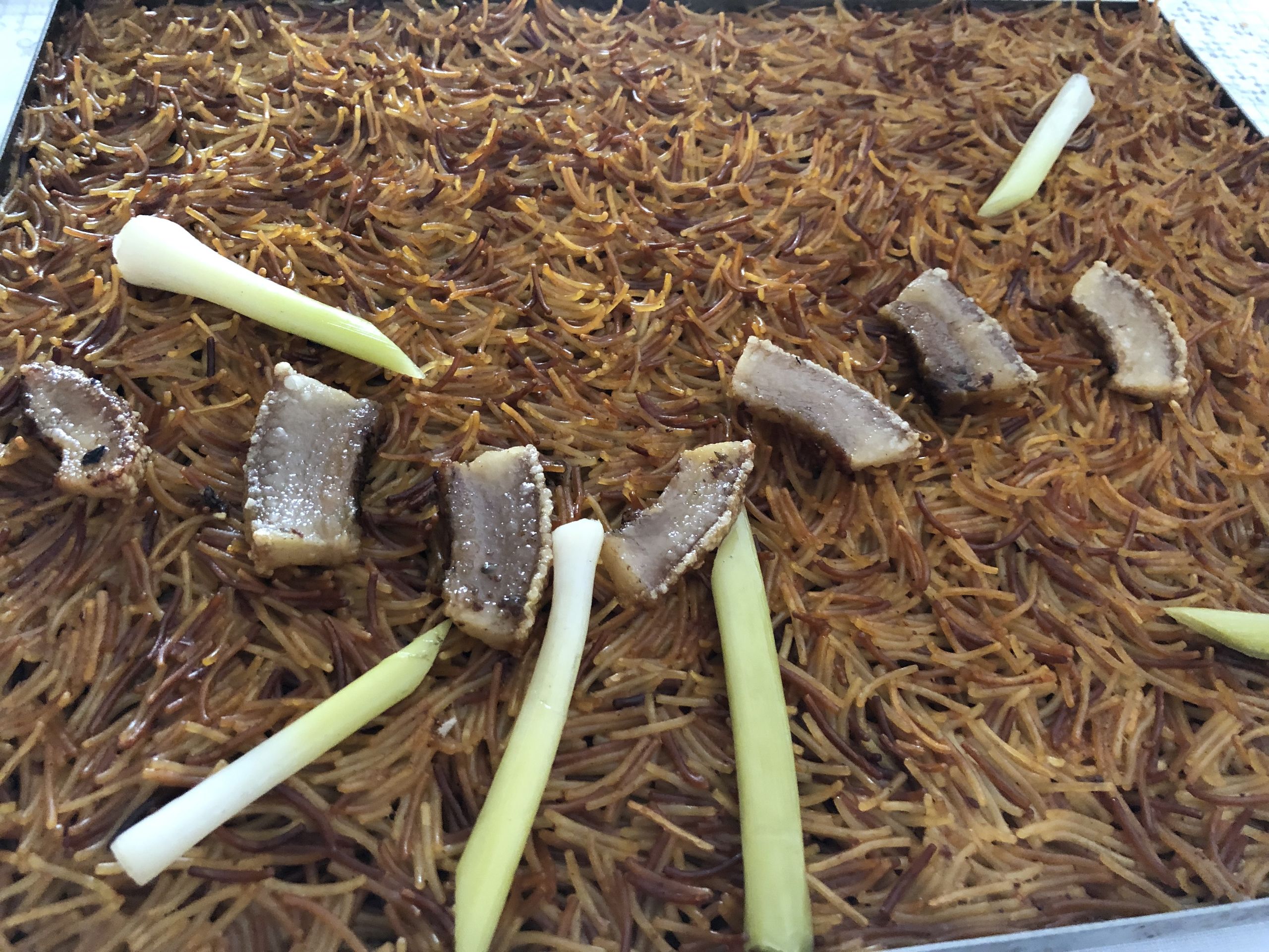 Crunchy fideuá de belly pork a baja temperatura y rematado en plancha, custodiado por ajetes tiernos.