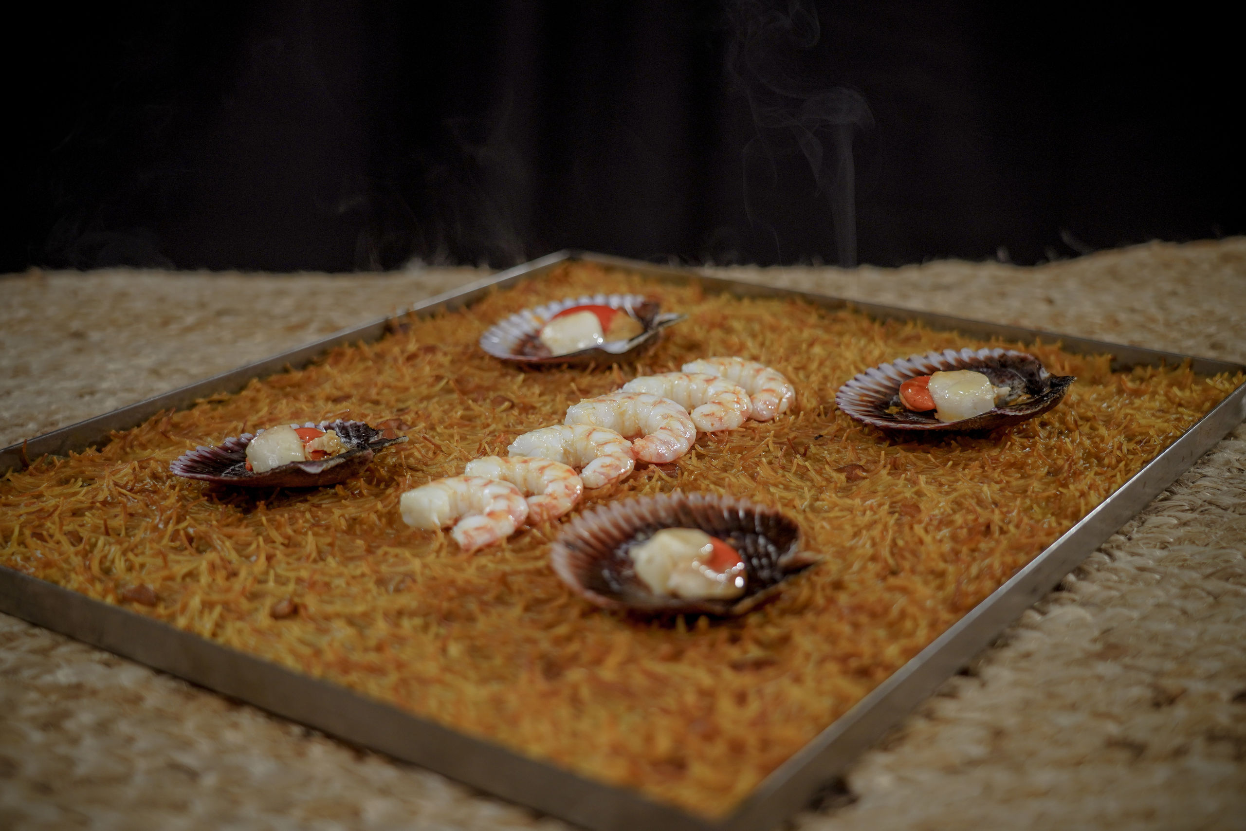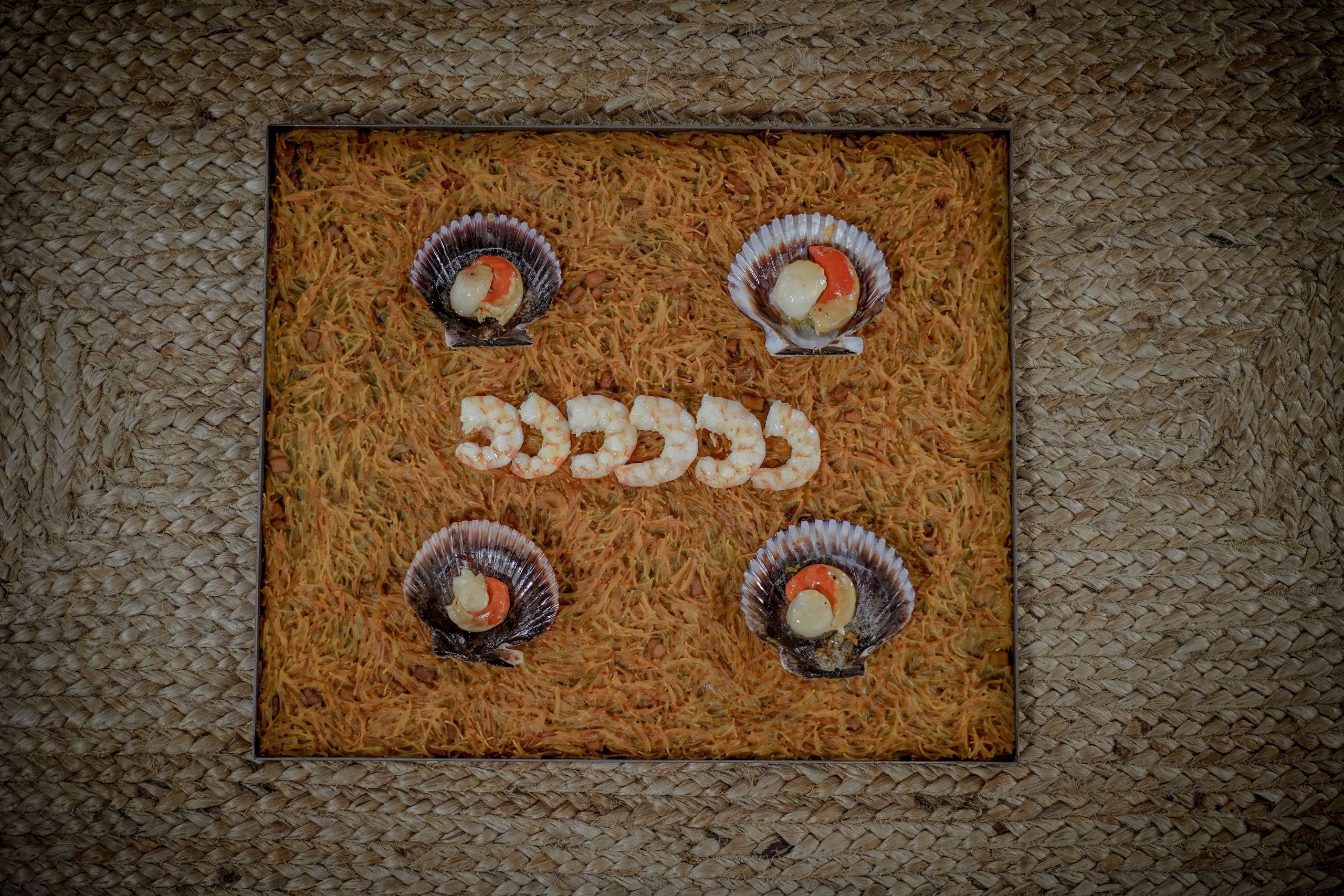 La fidegüiña con zamburiñas y gambas. Infusionan mantequilla con hueso de jamón, aliñada con pimienta, cebollino y oloroso